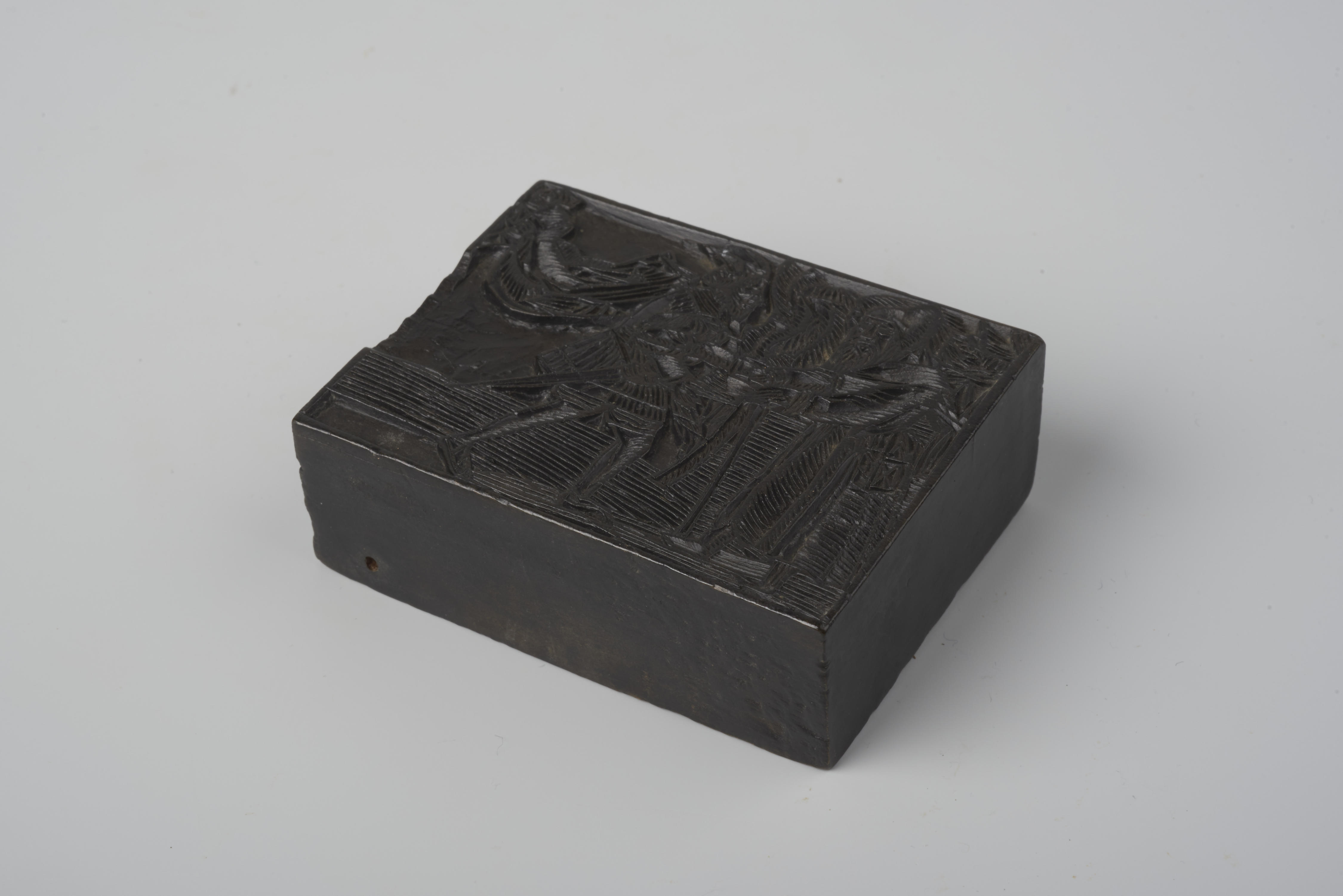 Houten cliché met de voorstelling van een jonge man die op een oudere man afloopt, terwijl in de lucht een vrouw zweeft.