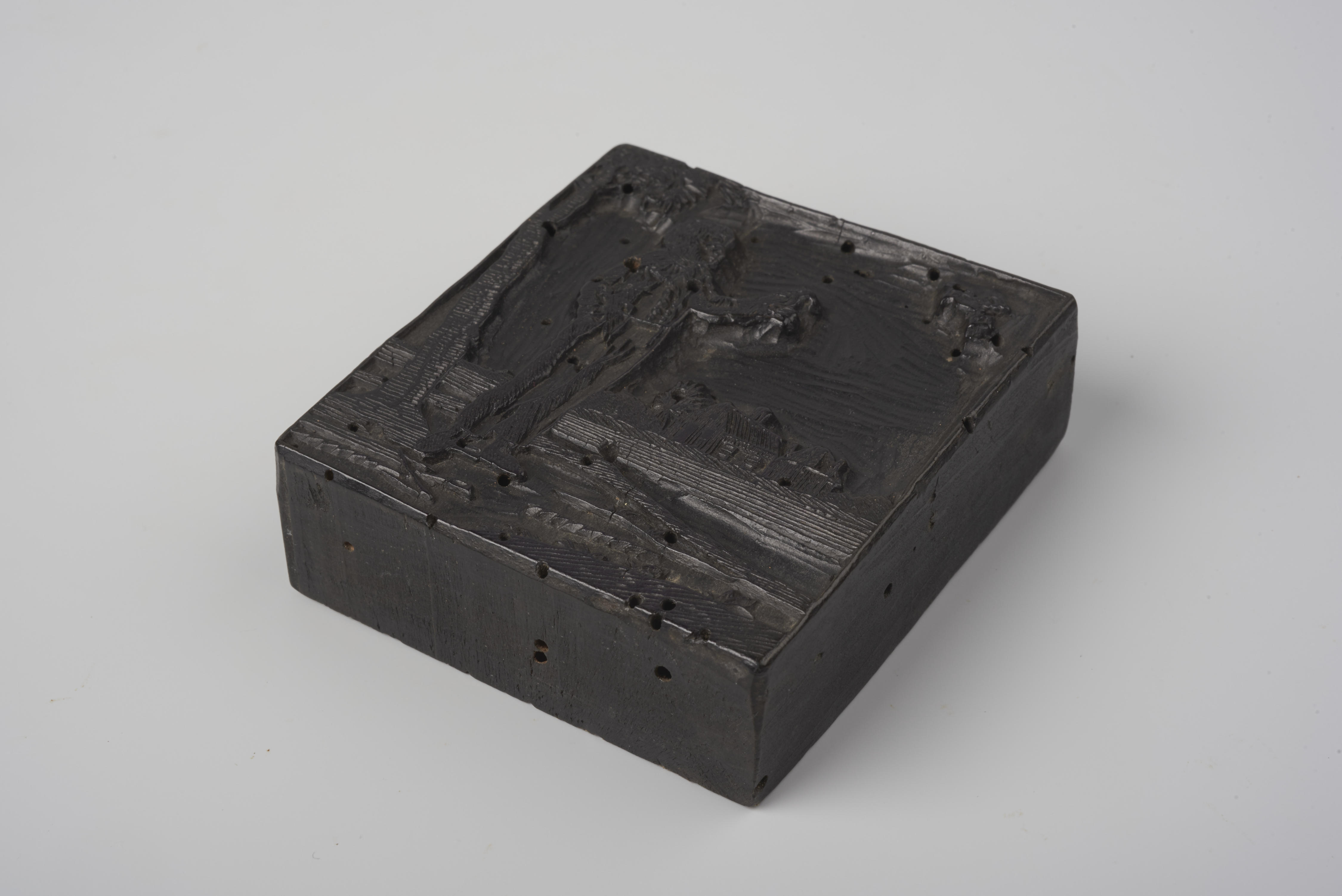 Houten cliché met de voorstelling van een jongen met een vogel op de hand en een vogel in de lucht.