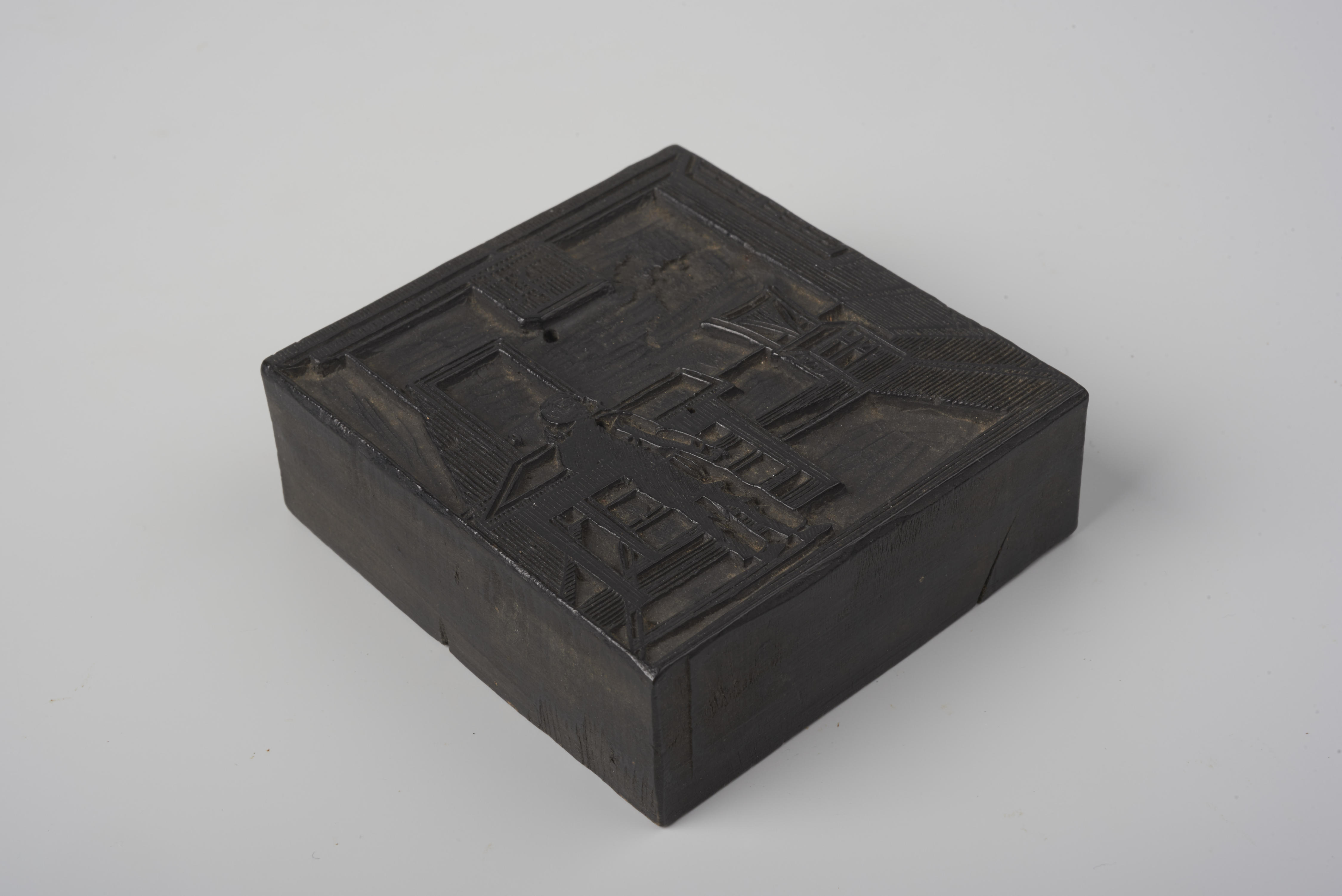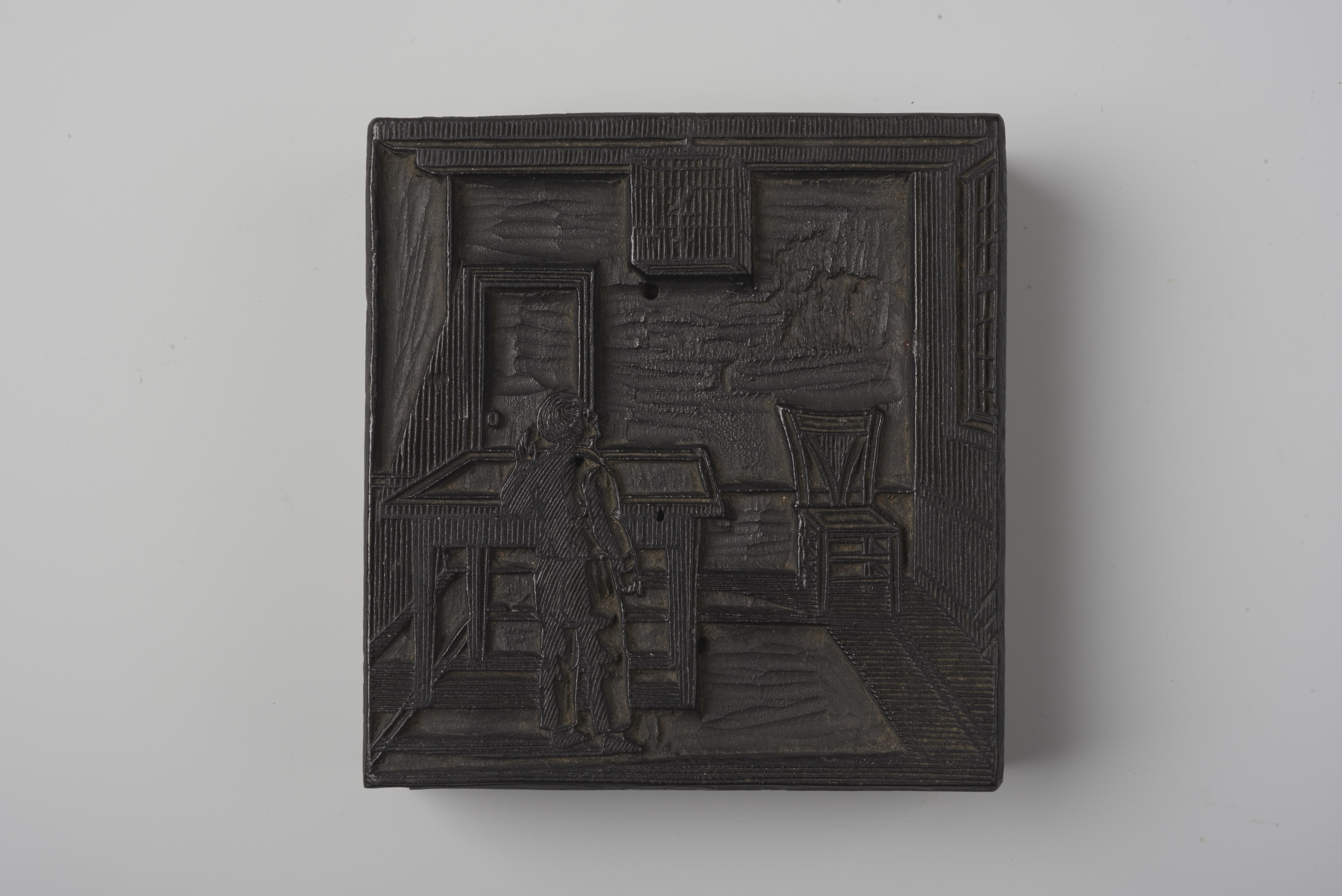 Houten cliché met de voorstelling van een interieur waarin een jongen naar een vogelkooi kijkt.