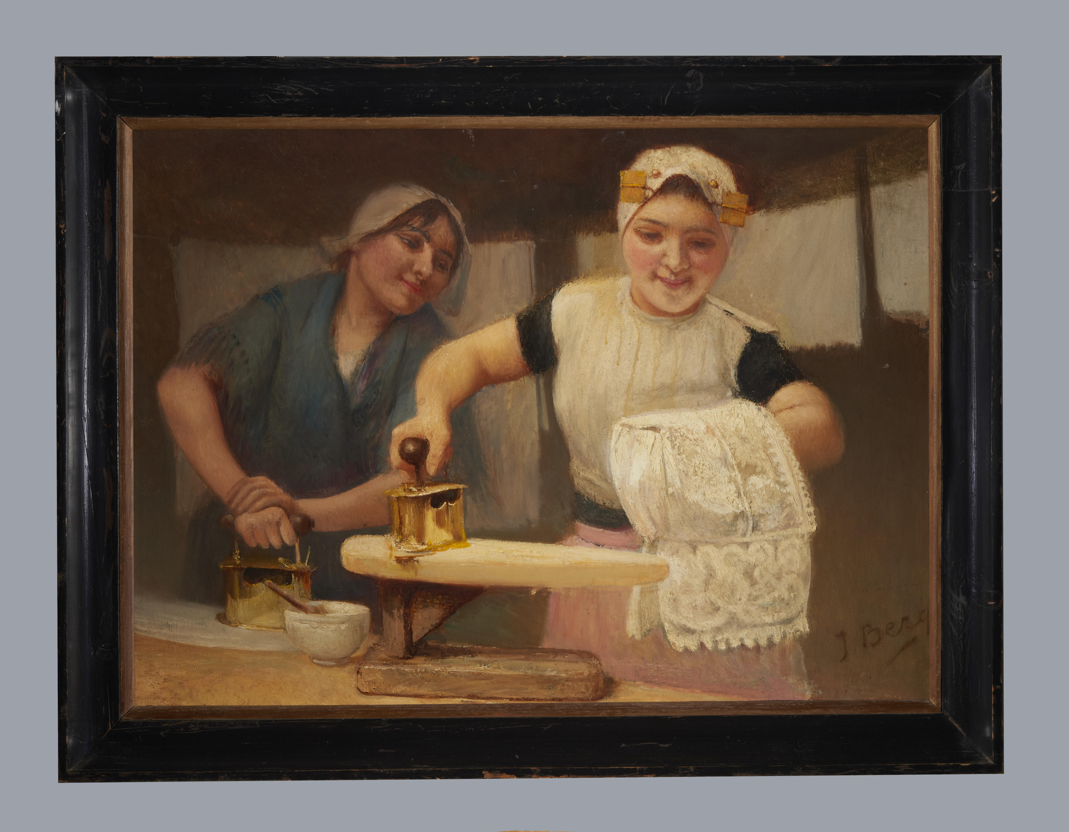 Olieverfschilderij van twee Zeeuwse meisjes bezig met het strijken van een muts. De muts hoort bij de rooms-katholieke dracht van Zuid-Beveland. Het voorste meisje legt de laatste hand aan de pasgewassen muts. Na het stijven is deze in vochtige toestand gestreken zodra de stijfsel er goed ingetrokken is. Vervolgens is de bol ingevouwen en geplooid. ...