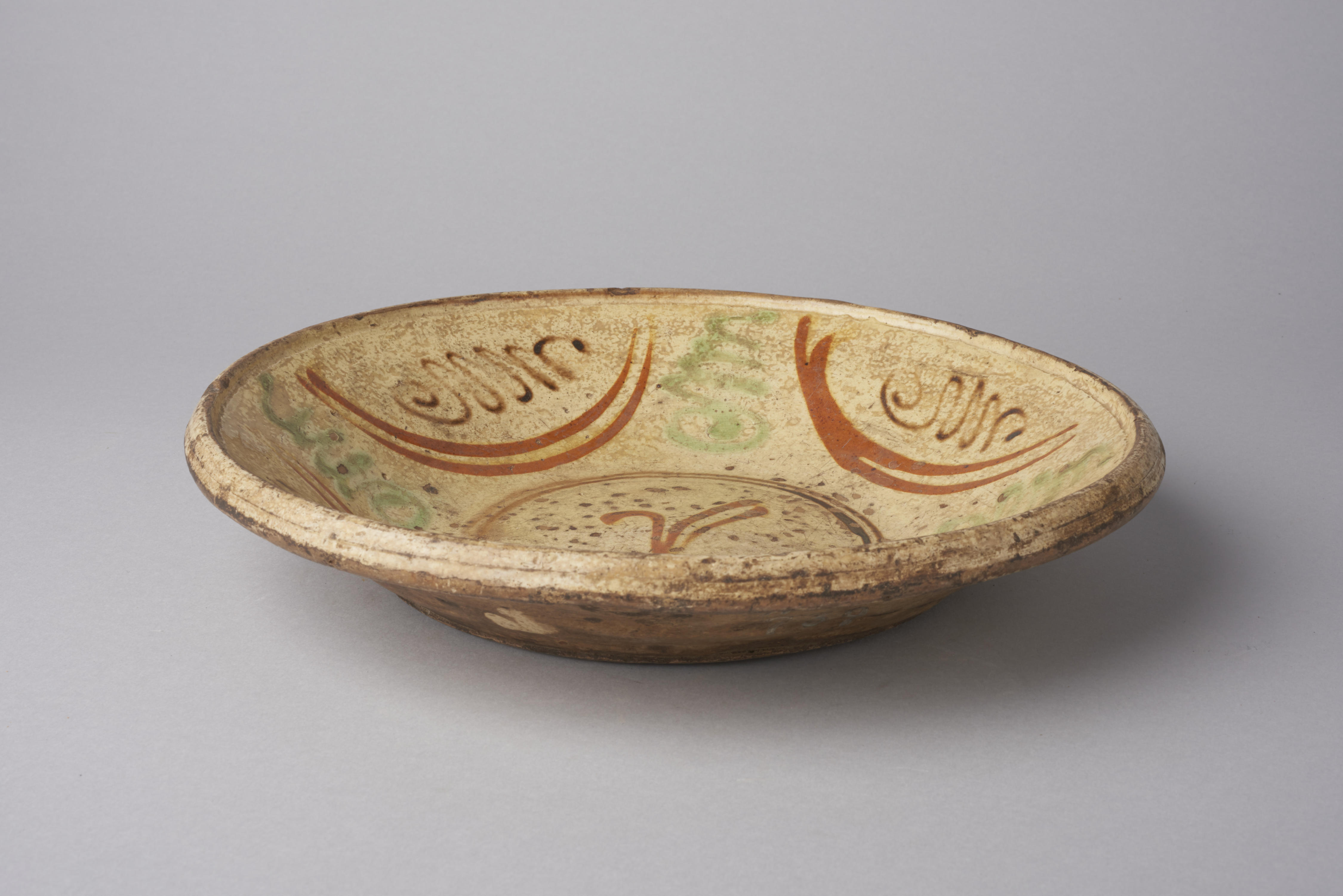 Schotel, versierd met geometrische ornamenten en pseudo-opschriften.