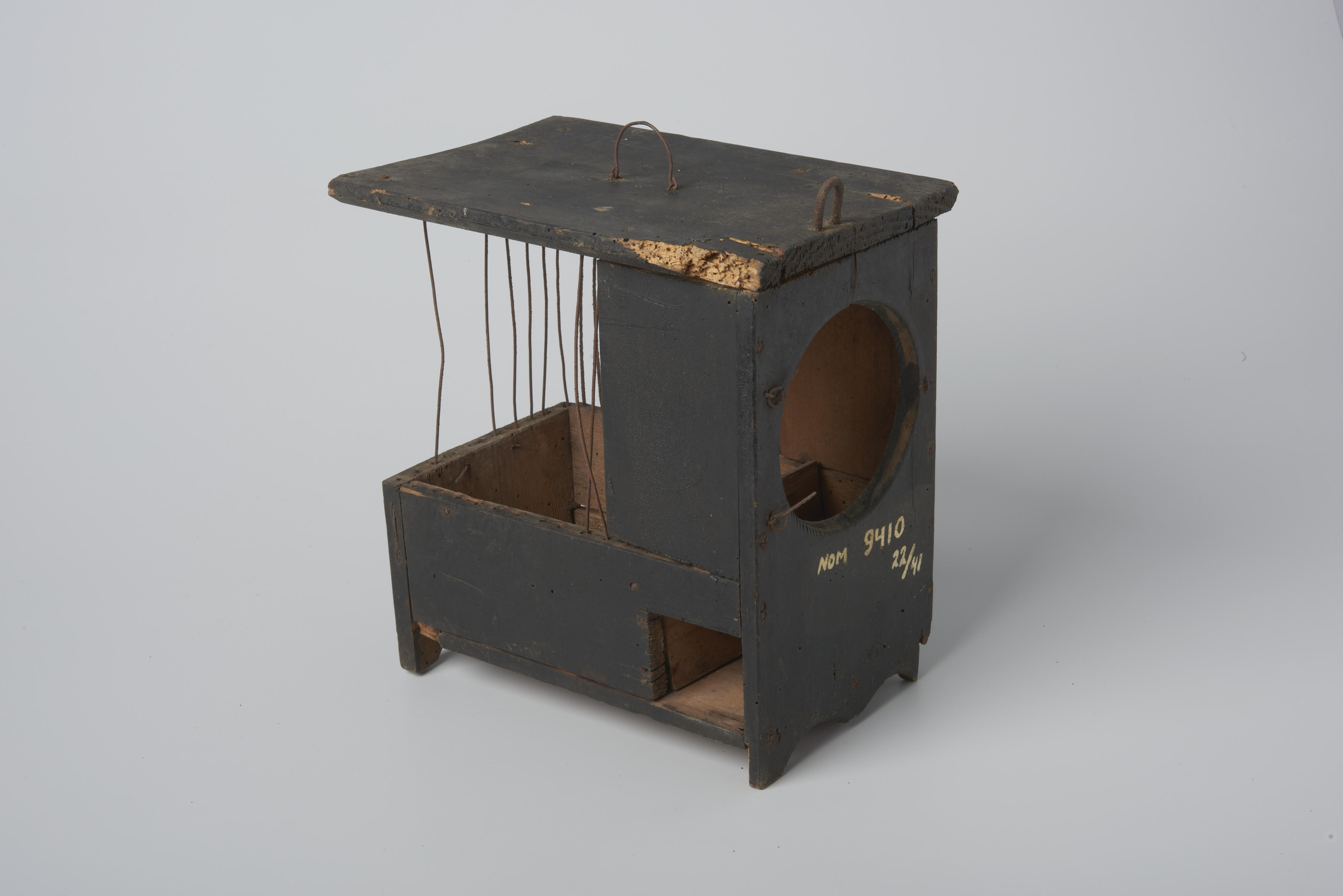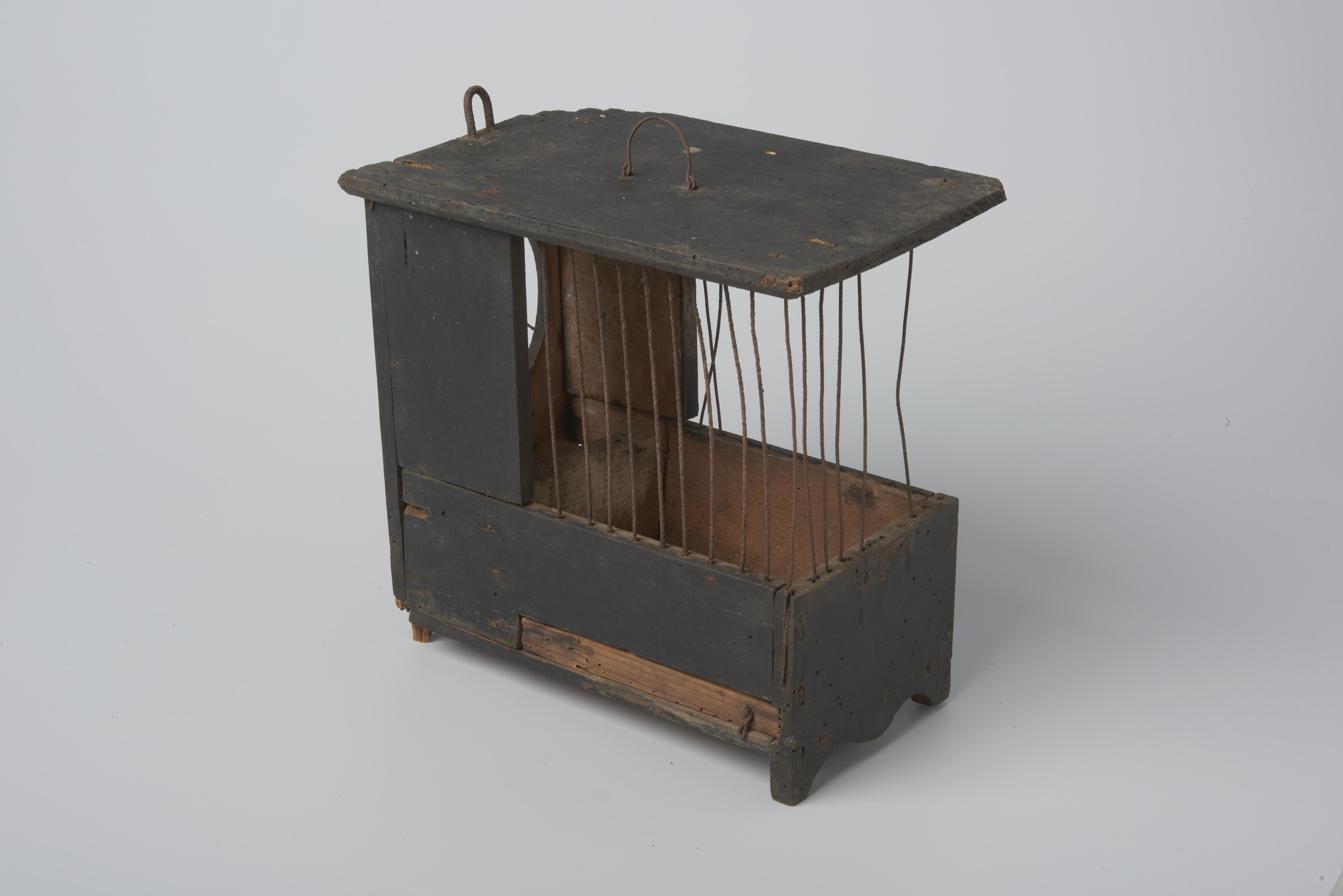 Houten vinkenkooi met ijzeren tralies.