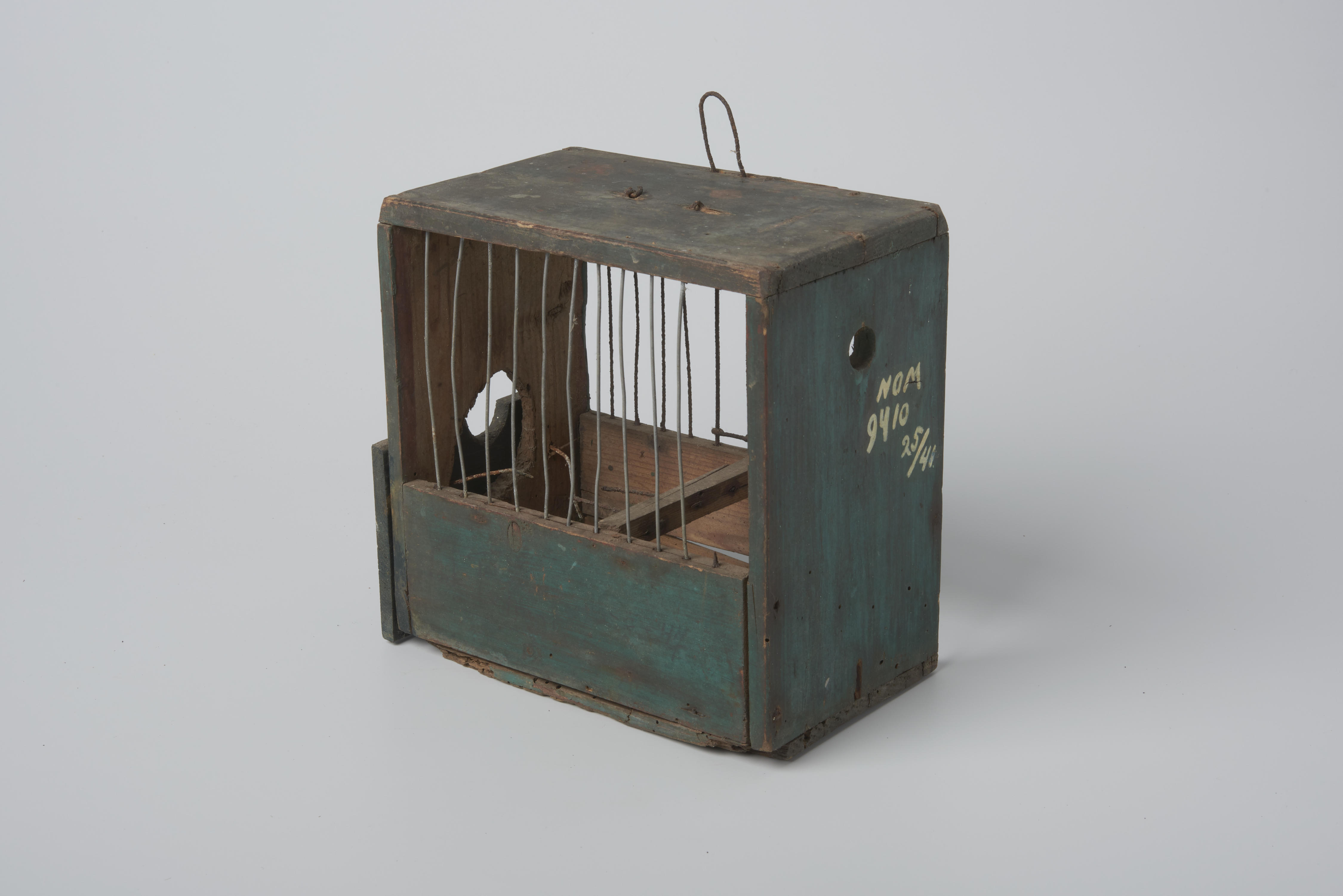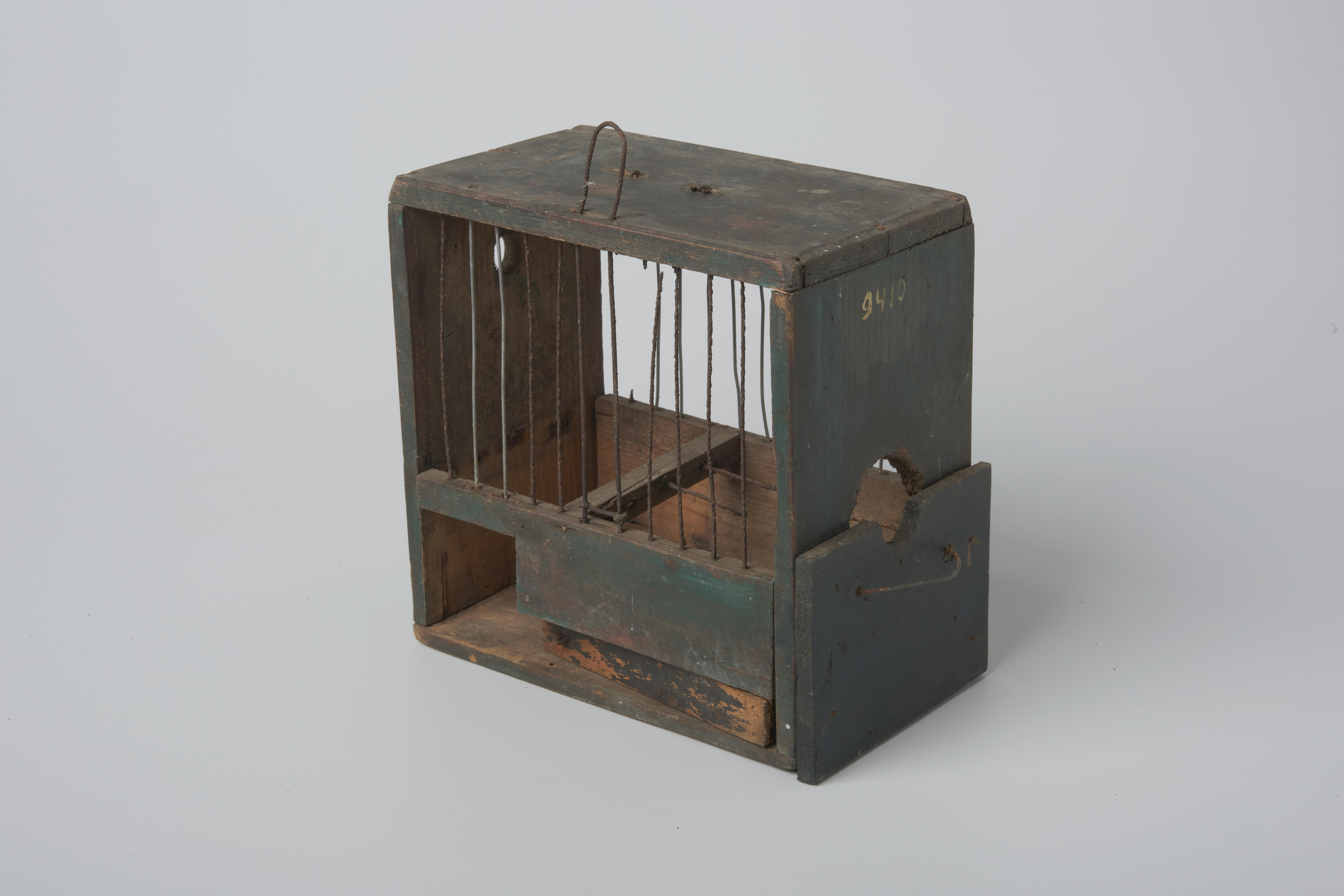 Houten vinkenkooi met ijzeren tralies.