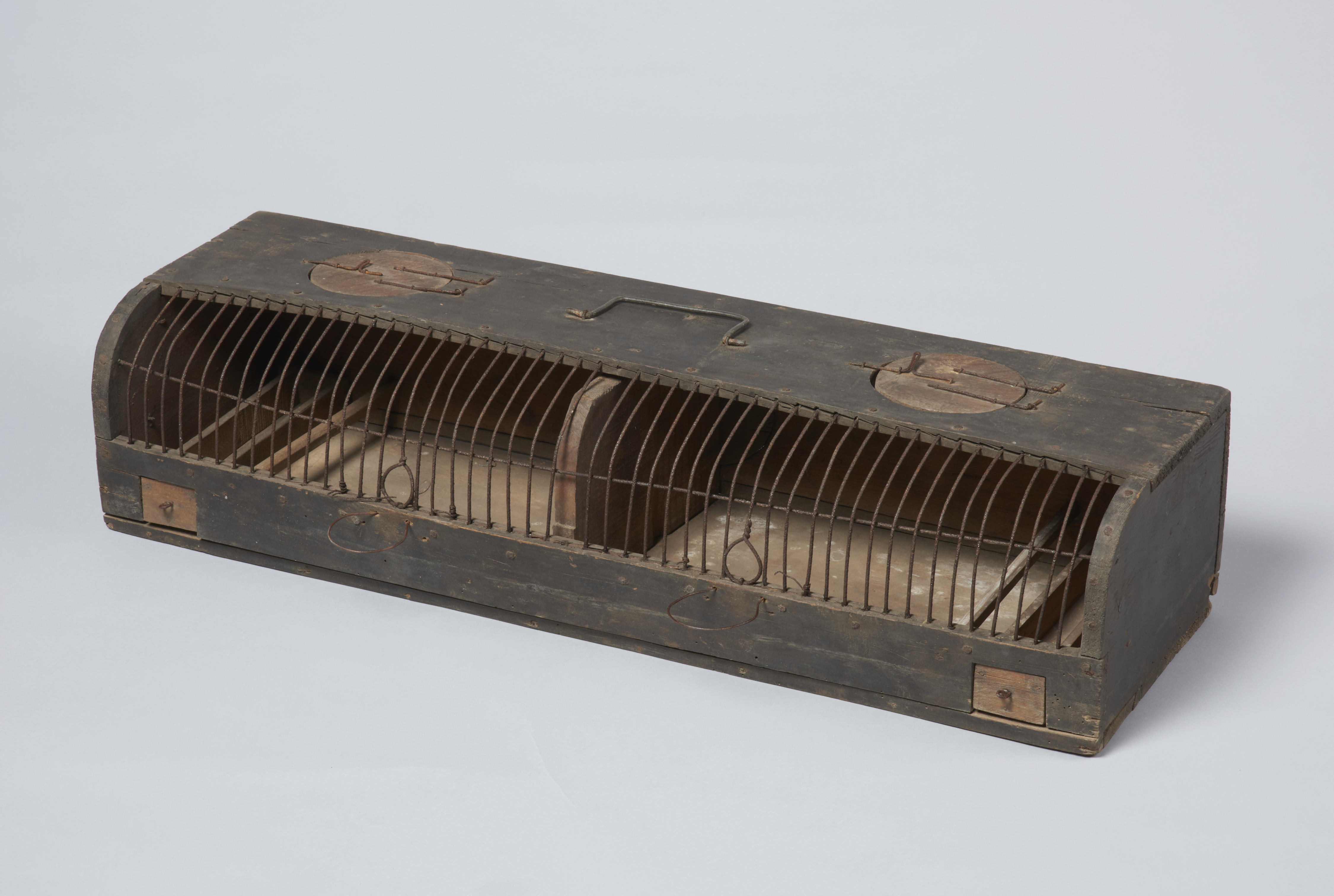 Houten vinkenkooi met ijzeren tralies.