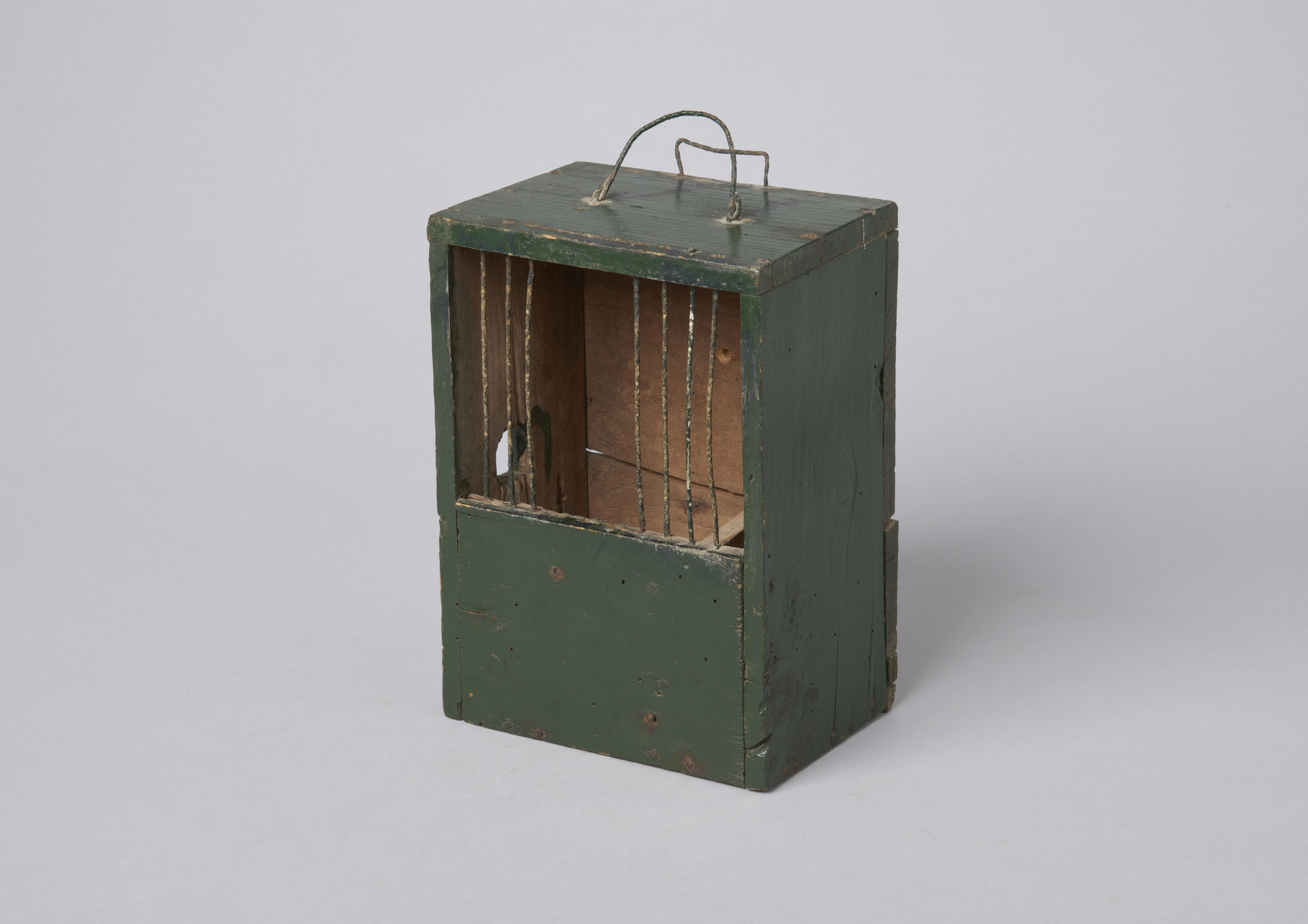 Houten vinkenkooi met metalen tralies.