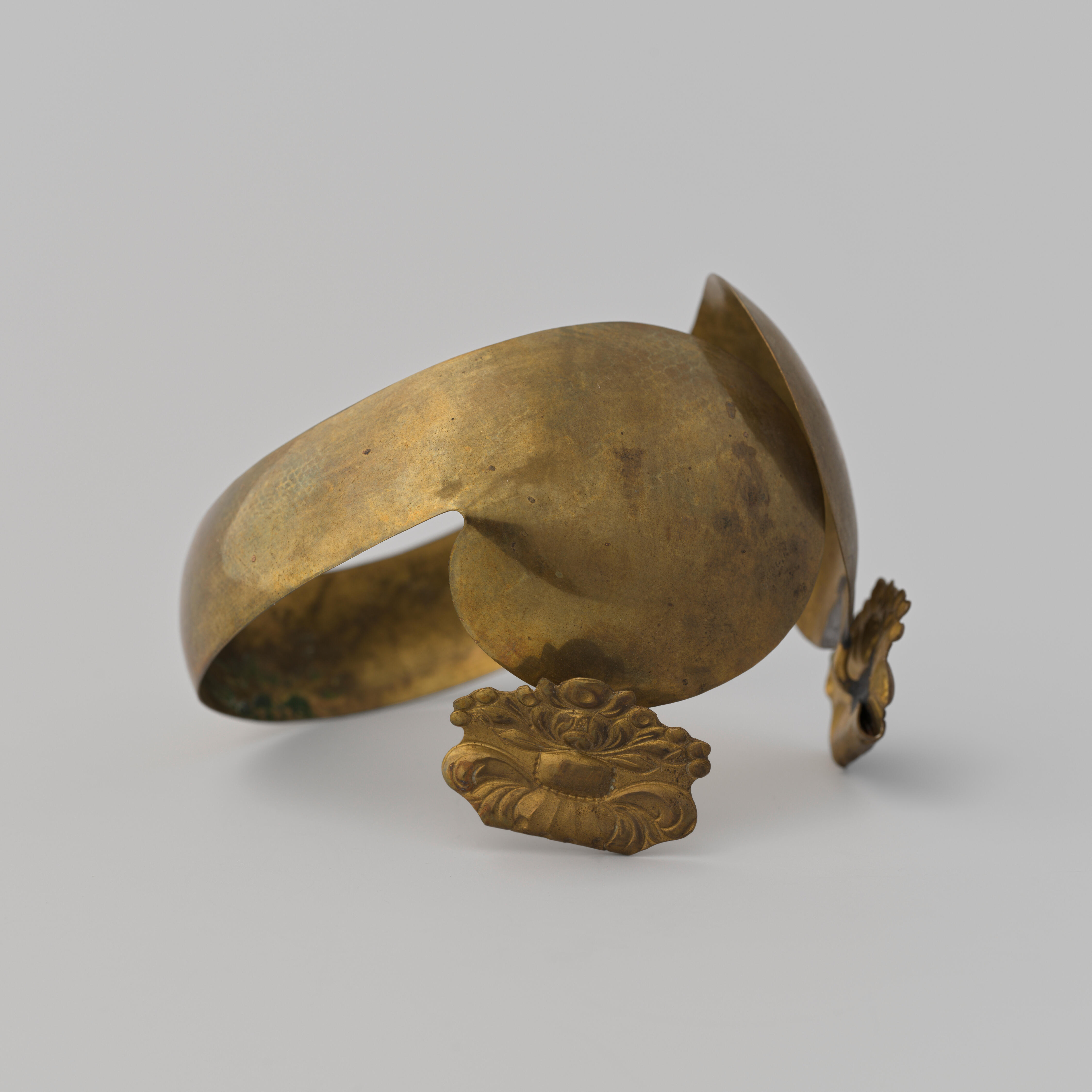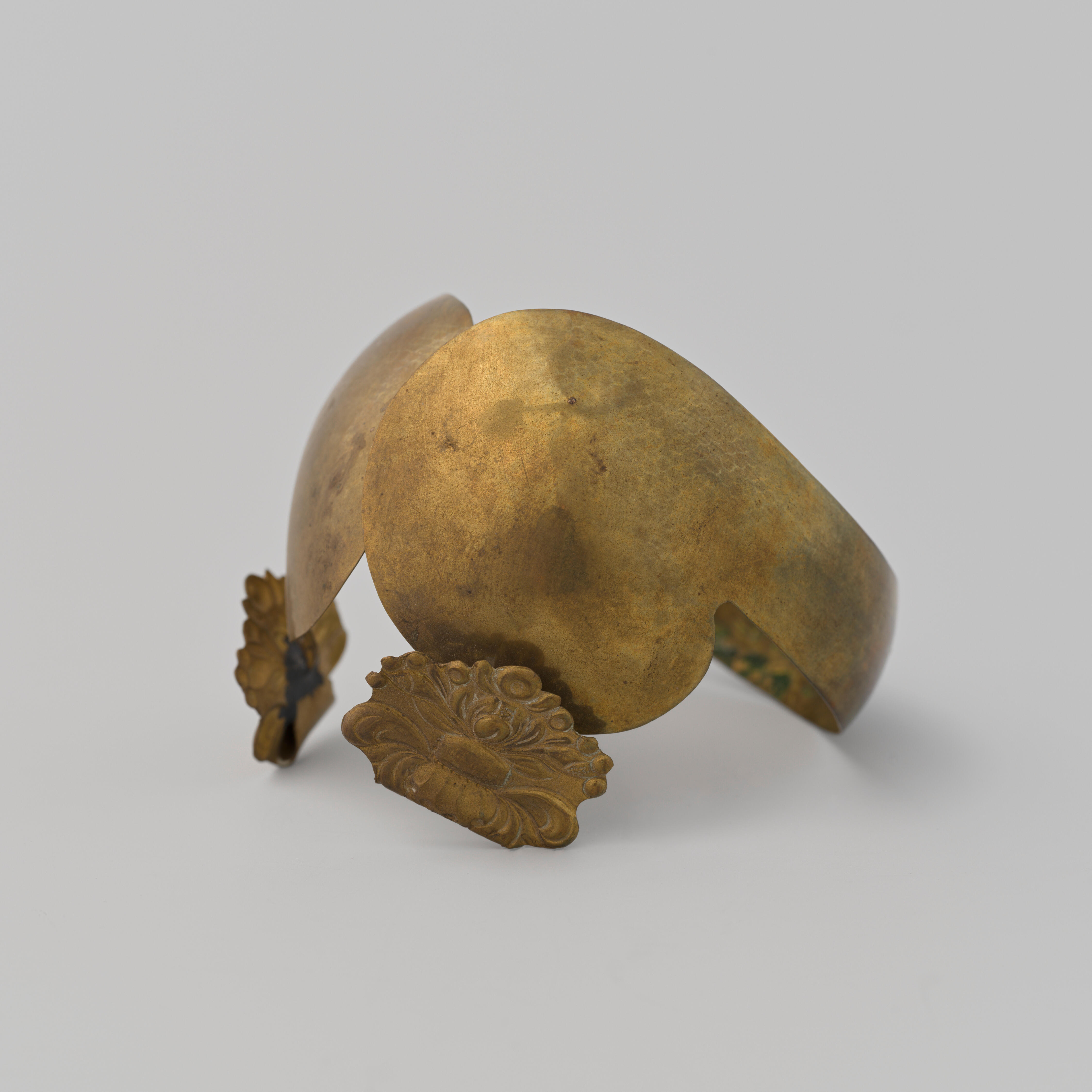 Een messing miniatuuroorijzer, gedragen door een pop die gekleed was in Friese streekdracht.