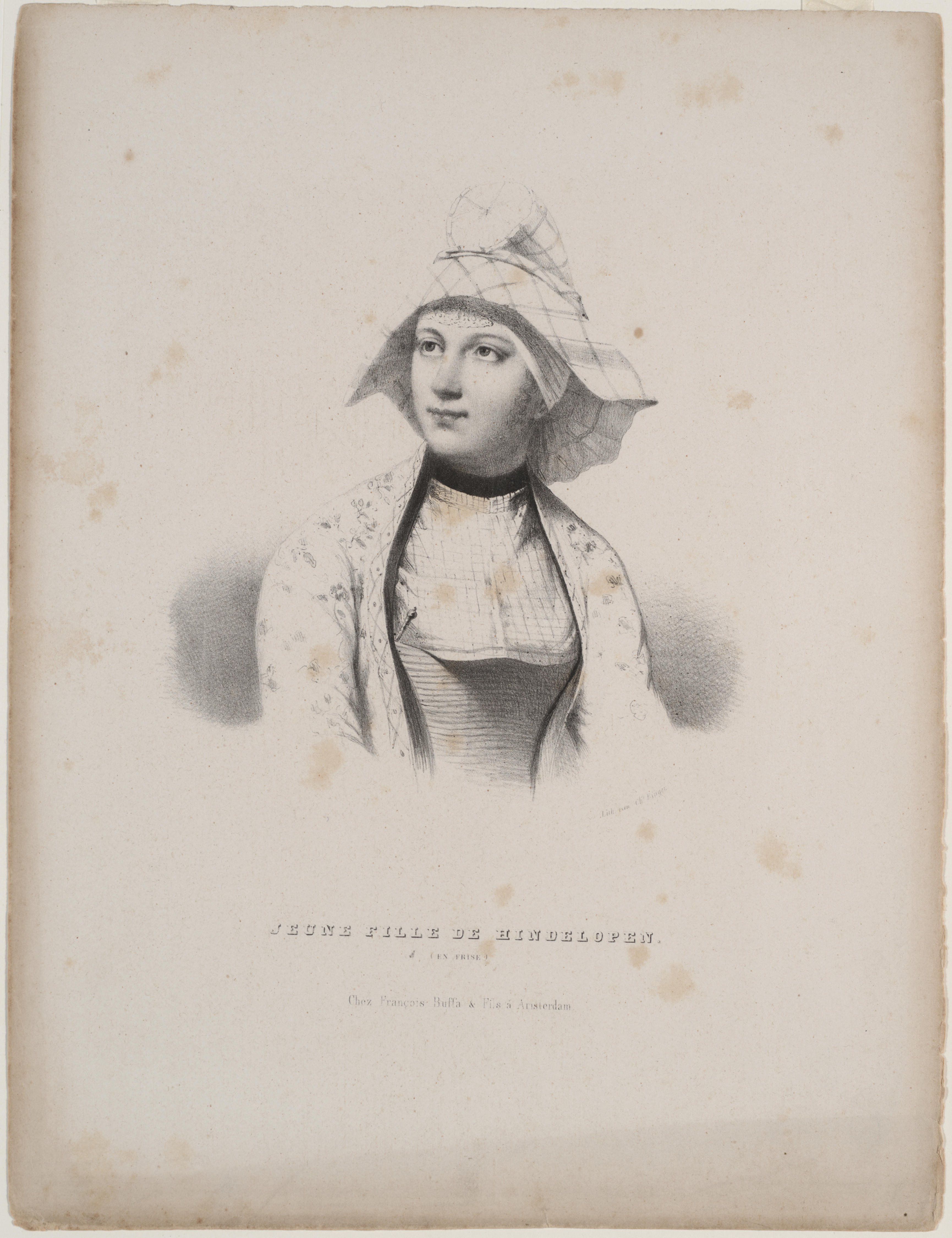 Lithografie met een afbeelding van een vrouw in Hindelooper dracht omstreeks 1840. Aan het model van de hoofdtooi, met een tonvormig hoedje onder de hoofddoek, is te zien dat deze vrouw getrouwd is. Dat zou ook te zien zijn aan de plaats waar zij haar rijgnaald draagt. Met de rijgnaald met veter werd het rijglijf, ...