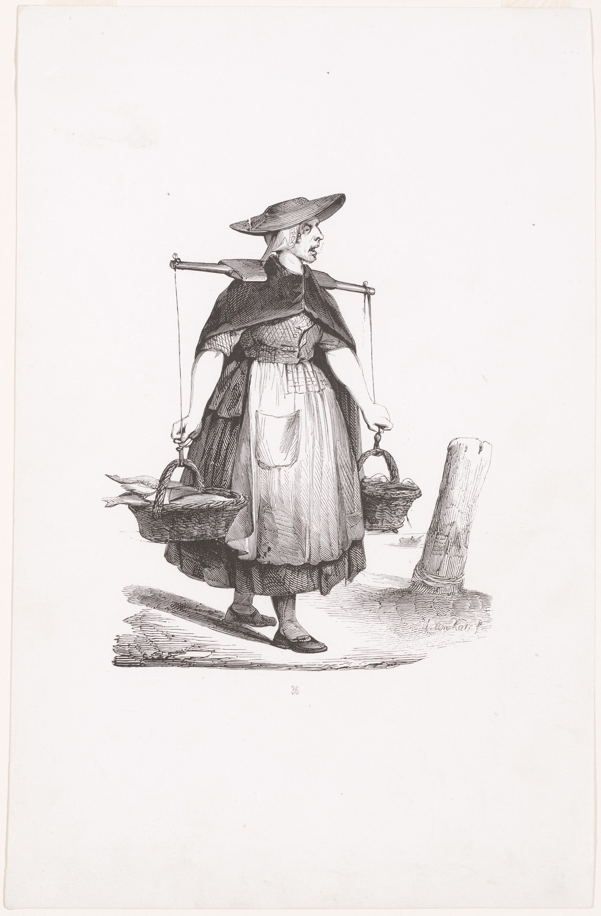 Prent van een visverkoopster uit Arnemuiden. De afbeelding is afkomstig uit het boek: 'De Nederlanden. karakterschetsen, kleederdrachten, houding en voorkomen van verschillende standen, met gravuren van den Heer Henry Brown' uit 1841.