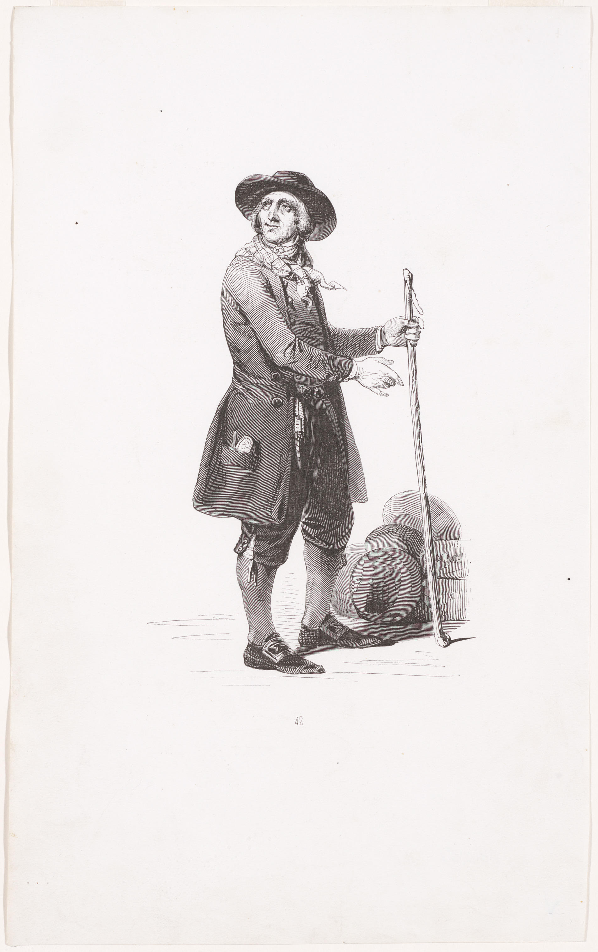 Prent van een boer uit Noord-Holland op de kaasmarkt. De afbeelding is afkomstig uit het boek: 'De Nederlanden. karakterschetsen, kleederdrachten, houding en voorkomen van verschillende standen, met gravuren van den Heer Henry Brown' uit 1841.