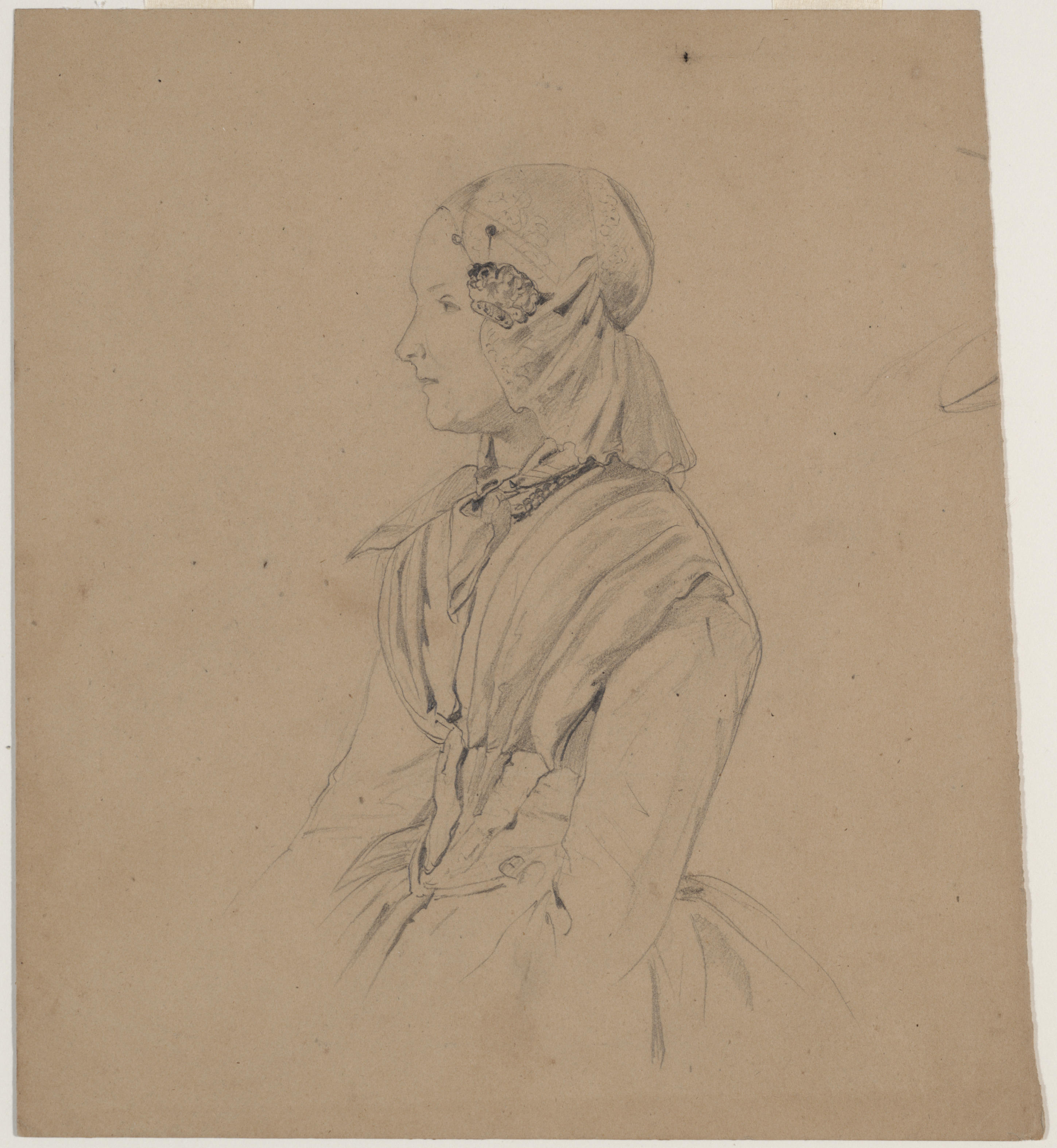 Voorstudie gemaakt voor plaat XLVI van: Nederlandsche kleederdragten, naar de natuur geteekend = costumes des Pays-Bas, dessinés d'après nature / door Valentijn Bing en [Jan] Braet von Ueberfeldt. - Amsterdam : [s.n.], 1857.