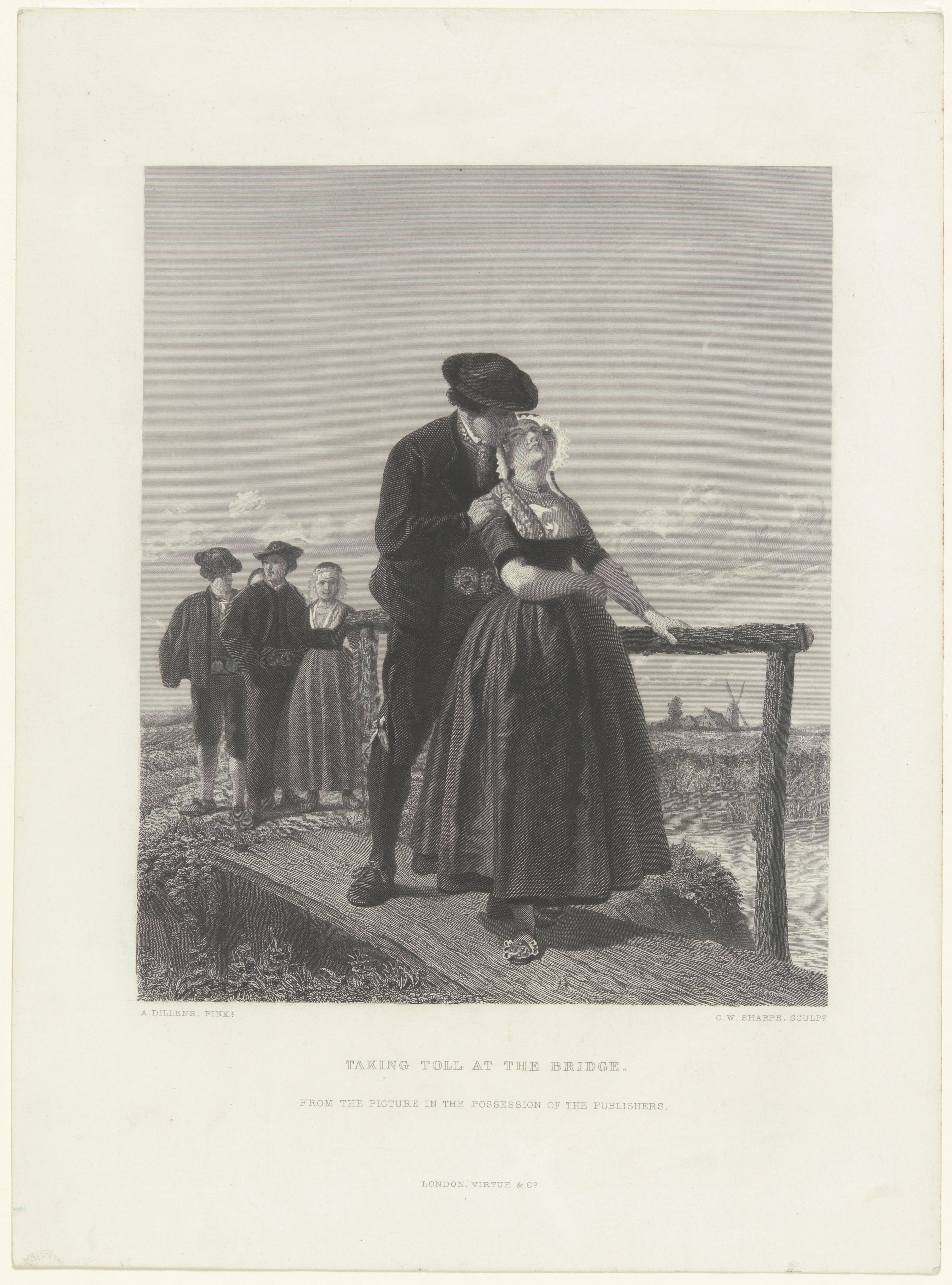 Prent van mannen en vrouwen in Zuid-Bevelandse dracht op een brug.