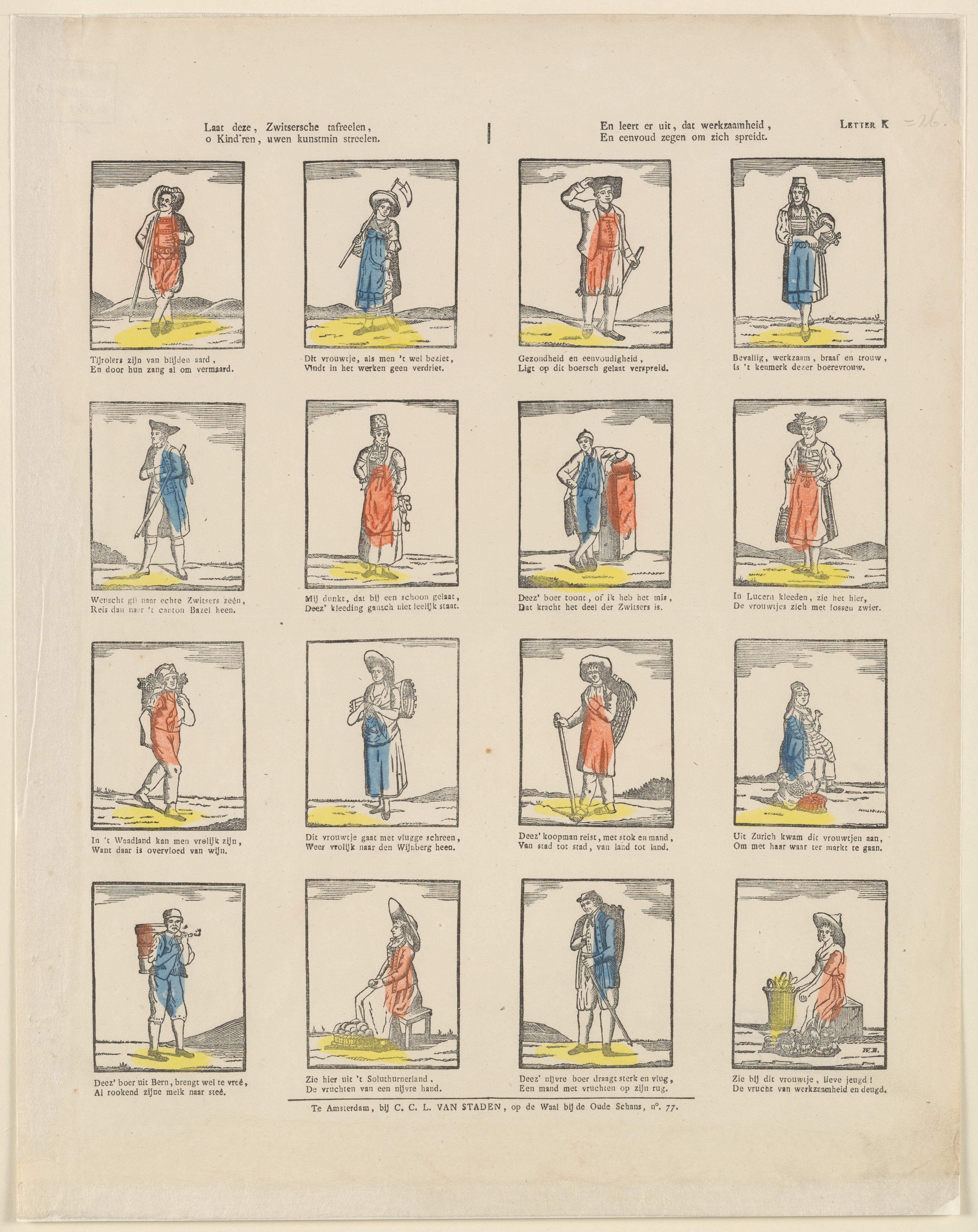 Prent met zestien afbeeldingen van allerlei personages uit Zwitserland, gedrukt met afzonderlijke houtsneden en ingekleurd met rood, geel en blauw. Onder elke afbeelding staat een onderschrift, gedrukt in boekdruk. De drukblokken voor deze prent zijn gegraveerd door Willem Bal (signatuur in afbeelding 14).