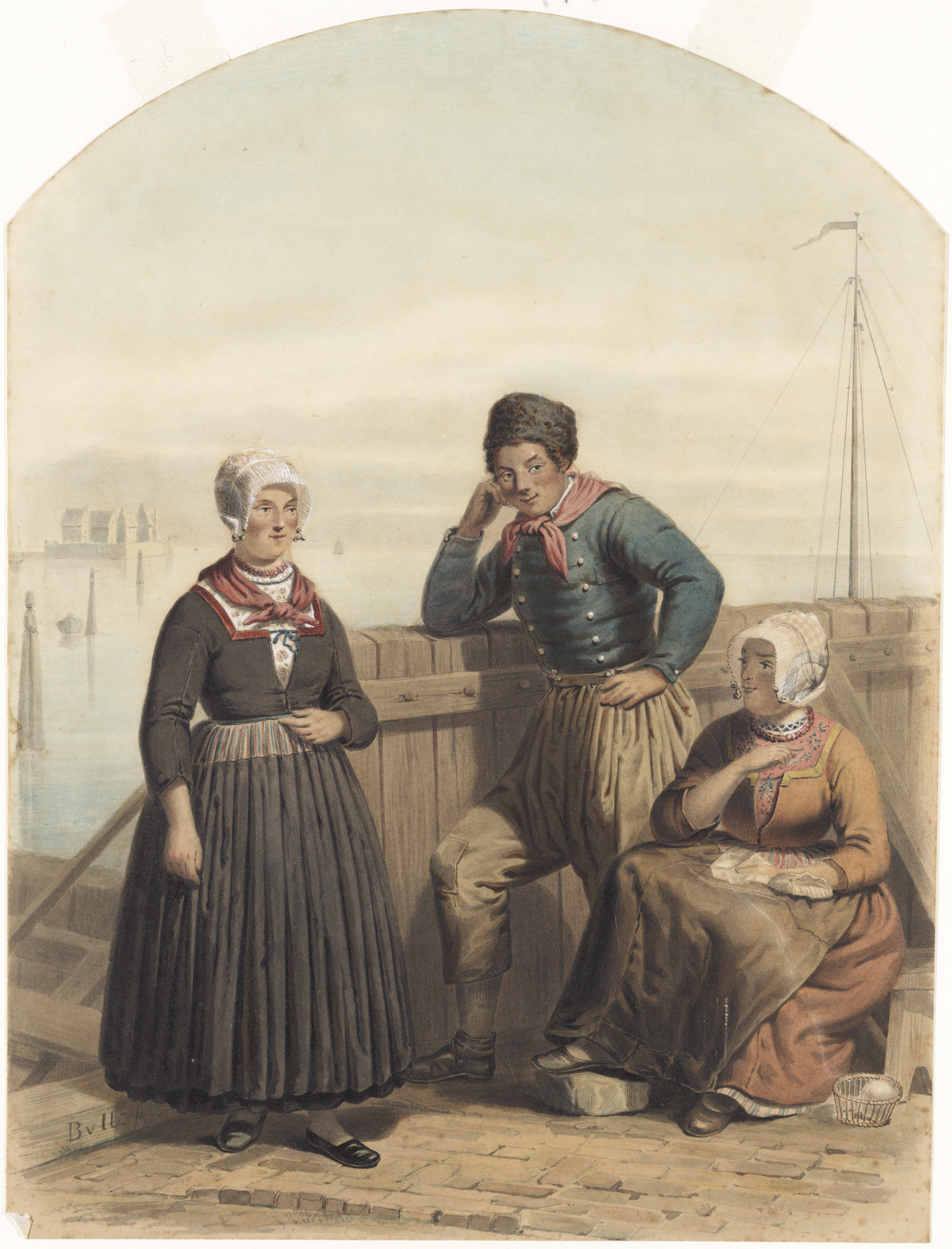 Voorstelling van de dracht van het eiland Schokland rond 1850. Aquarel gemaakt voor plaat X van: Nederlandsche kleederdragten, naar de natuur geteekend = costumes des Pays-Bas, dessinés d'après nature / door Valentijn Bing en [Jan] Braet von Ueberfeldt. - Amsterdam : [s.n.], 1857.