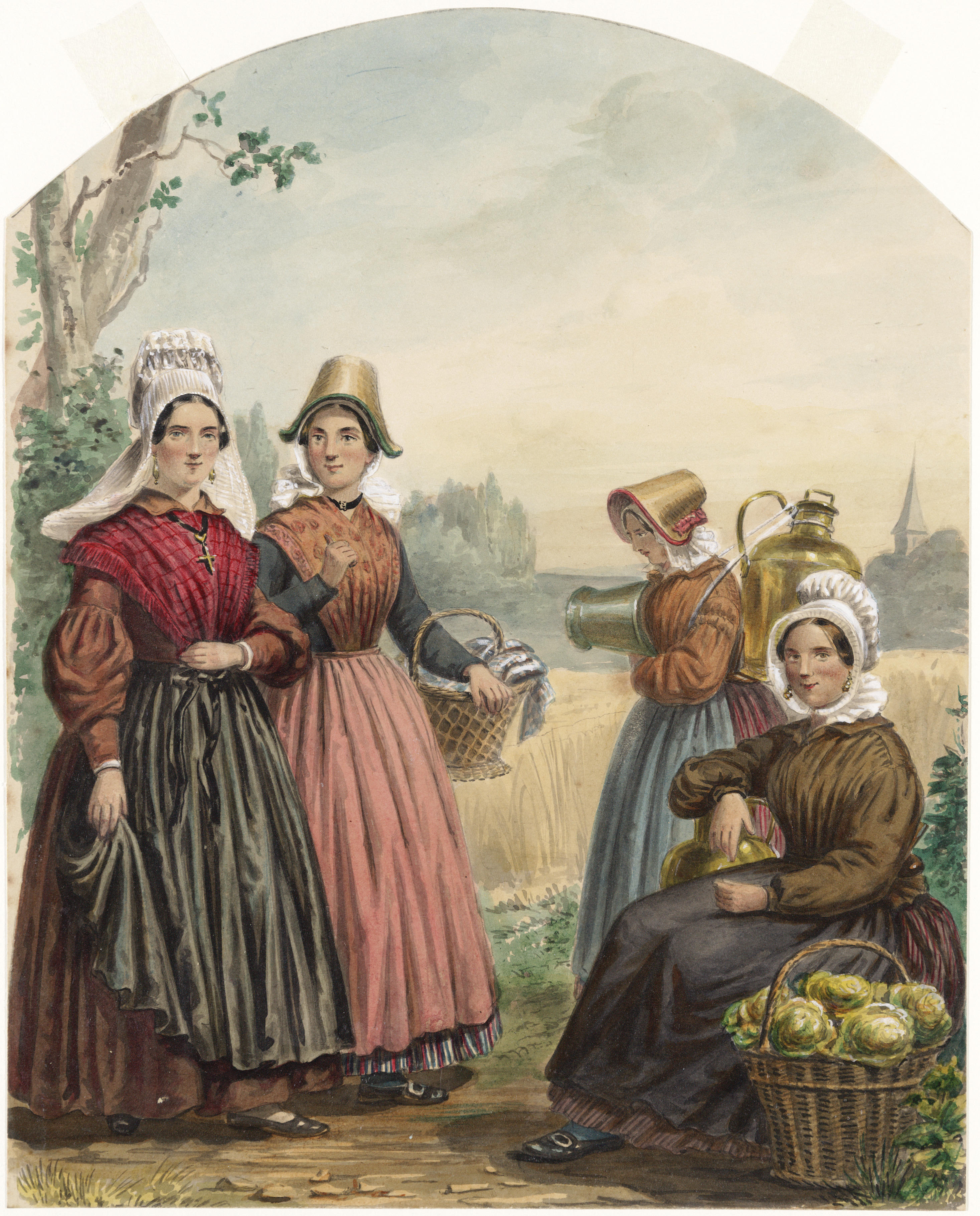 De vrouwen op de aquarel gaan ter markt. Ze zijn gekleed in drachten van Noord-Brabant, omstreeks 1850. Aquarel gemaakt voor plaat LI van: Nederlandsche kleederdragten, naar de natuur geteekend = costumes des Pays-Bas, dessinés d'après nature / door Valentijn Bing en [Jan] Braet von Ueberfeldt. - Amsterdam : [s.n.], 1857.