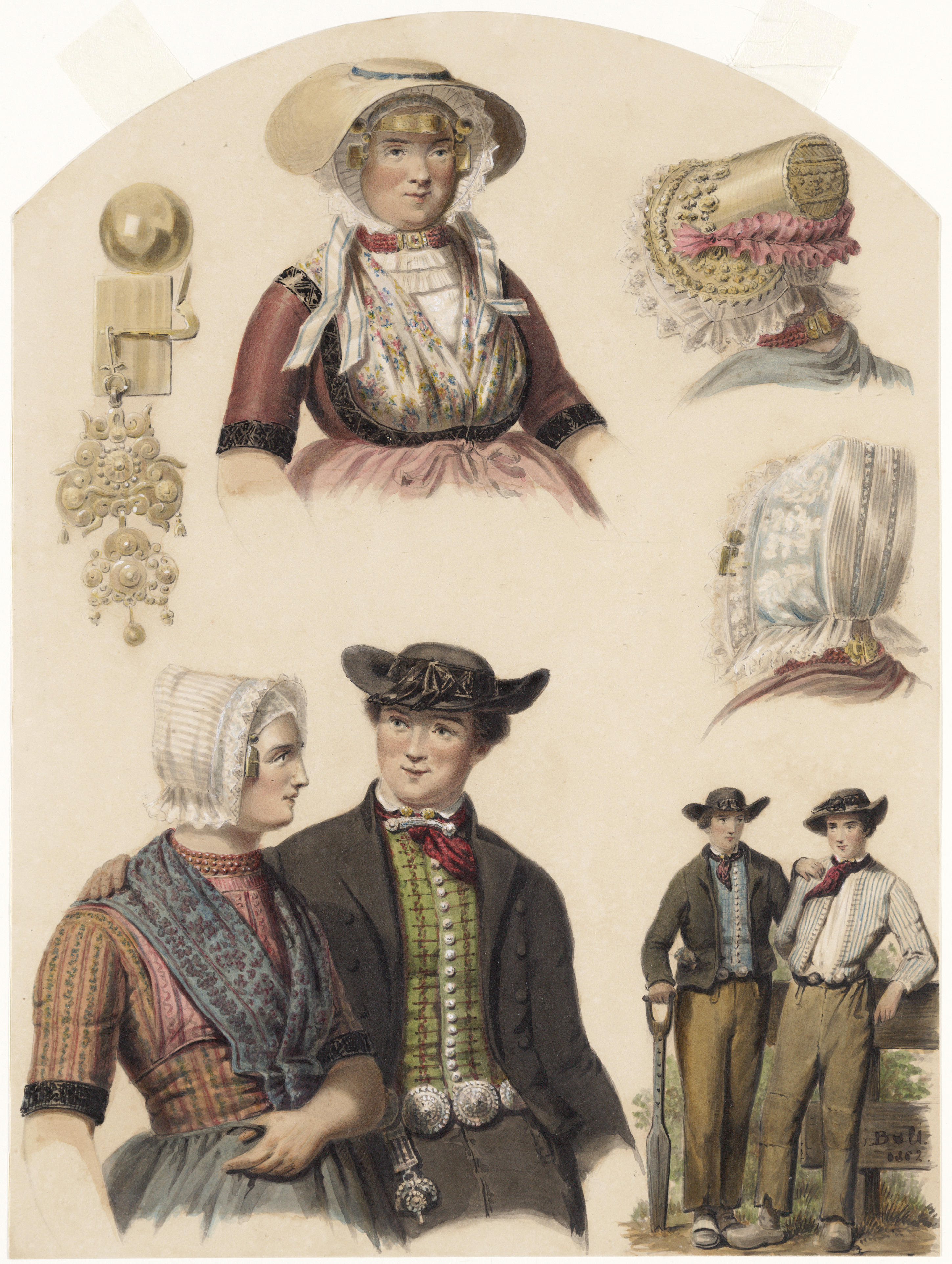 Aquarel met afbeeldingen van de Zuid-Bevelandse dracht omstreeks 1850. Aquarel gemaakt voor plaat XXXII van: Nederlandsche kleederdragten, naar de natuur geteekend = costumes des Pays-Bas, dessinés d'après nature / door Valentijn Bing en [Jan] Braet von Ueberfeldt. - Amsterdam : [s.n.], 1857.