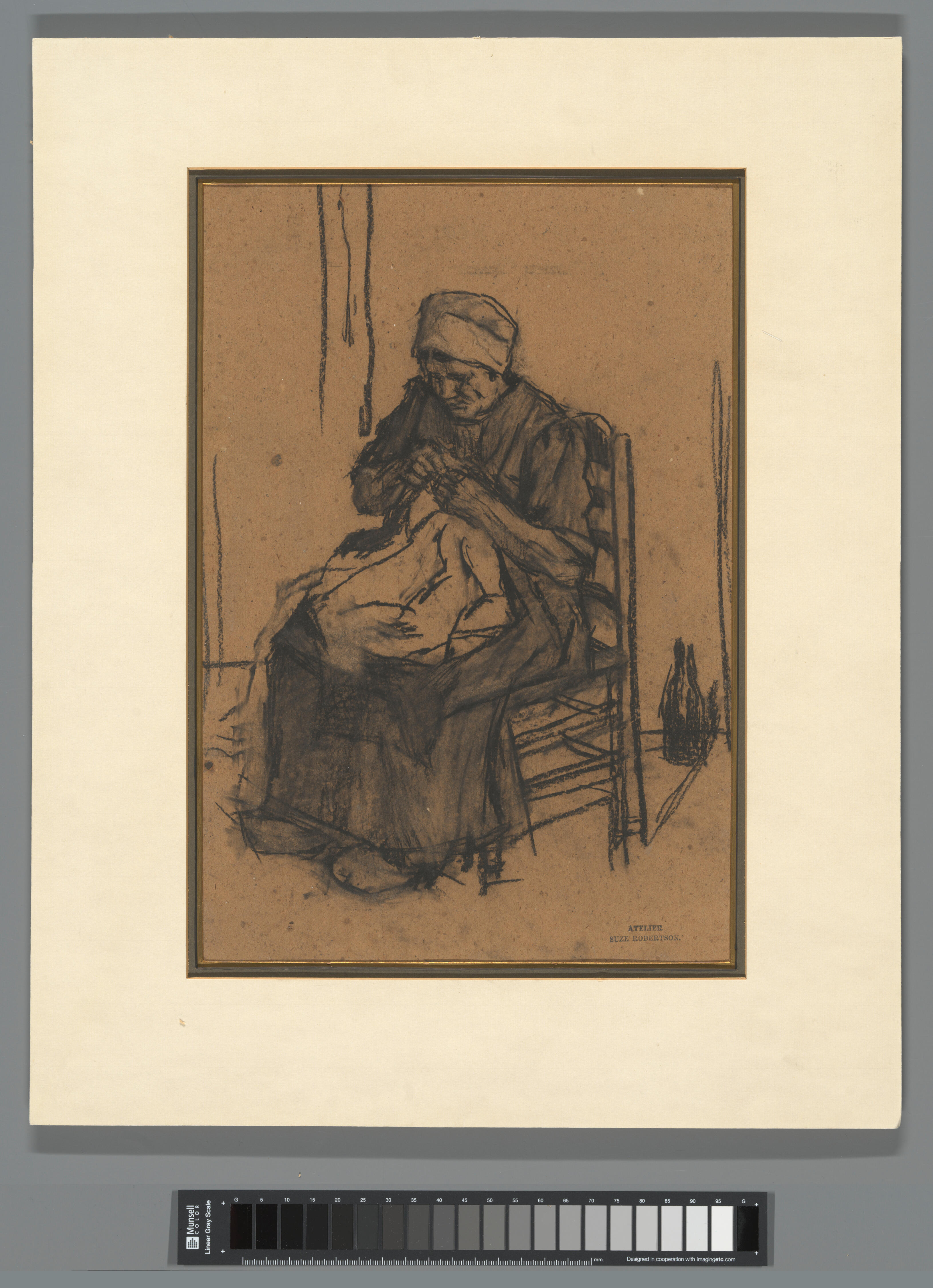 Houtskooltekening van een Brabantse boerin met een ondermuts op, bezig met verstelwerk. De tekening is gemaakt door Suze Robertson. Robertson werkte in 1883 in Dongen, tussen 1895 en 1898 in Etten-Leur en tussen 1903 en 1904 in Heeze. Mogelijk is dit werk van een Brabantse boerin tijdens of na deze periode gemaakt.