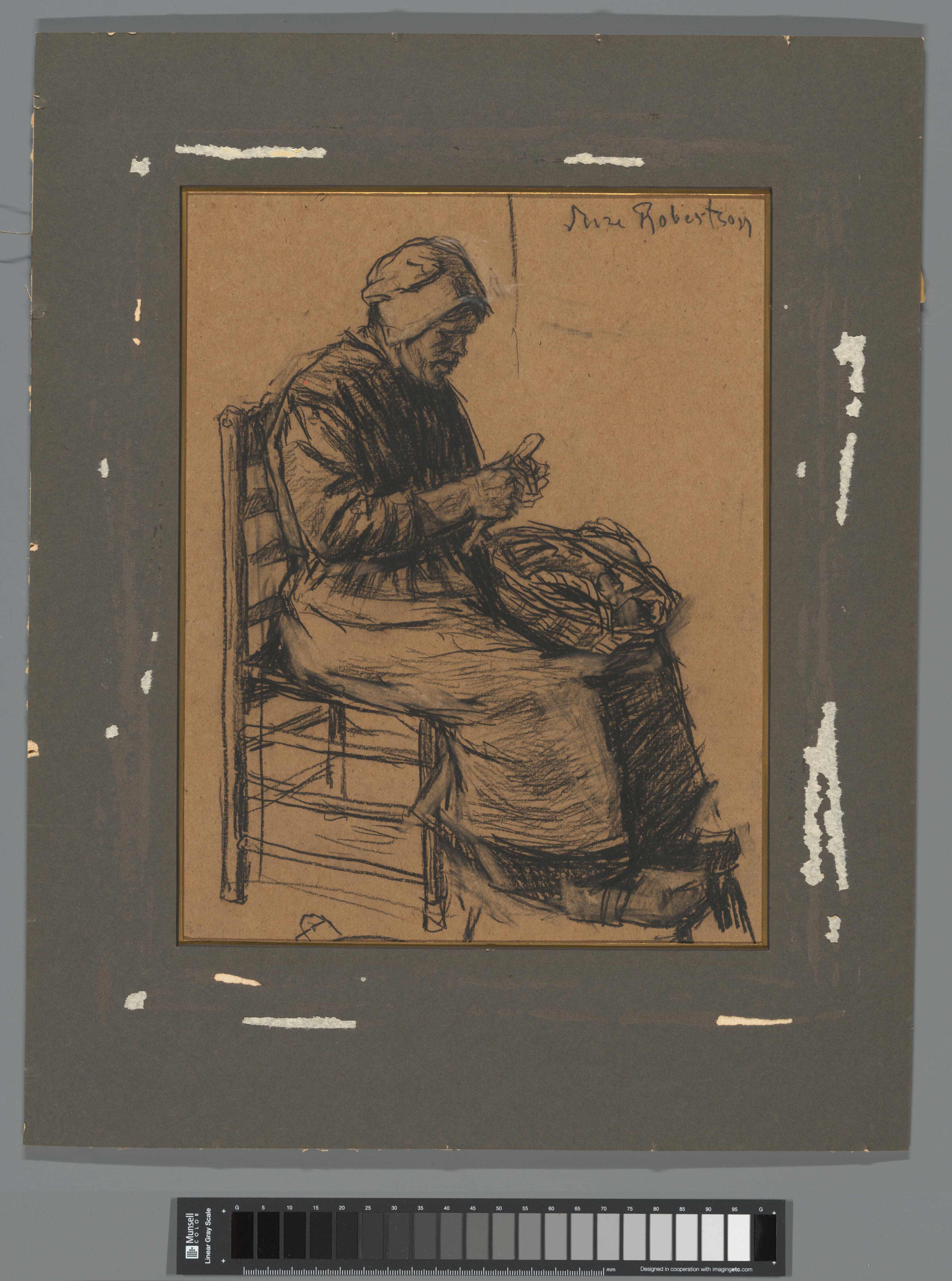 Houtskooltekening van een Brabantse boerin met een ondermuts op, bezig met het schillen van aardappels. De tekening is gemaakt door Suze Robertson. Robertson werkte in 1883 in Dongen, tussen 1895 en 1898 in Etten-Leur en tussen 1903 en 1904 in Heeze. Mogelijk is dit werk van een Brabantse boerin tijdens of na deze periode gemaakt.