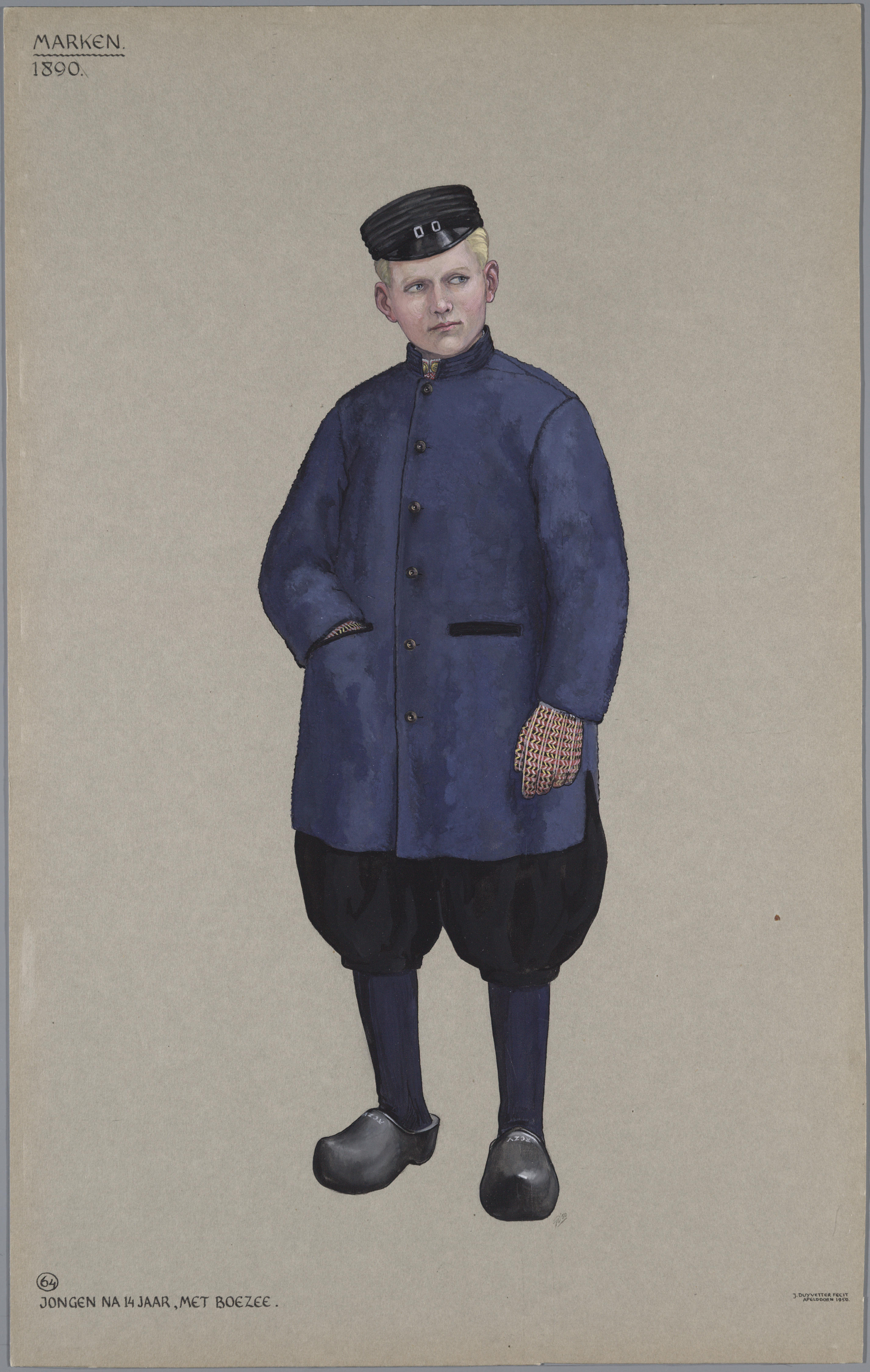 Jongen in dracht van Marken rond 1890. De jongen draagt een 'boezee'. De boezee is een overjas, gemaakt van 'zeeruig'. Deze werd gedragen door Marker mannen en door jongens ouder dan 14 jaar als het erg koud was. Aan zijn handen draagt de jongen 'itse wanten'.