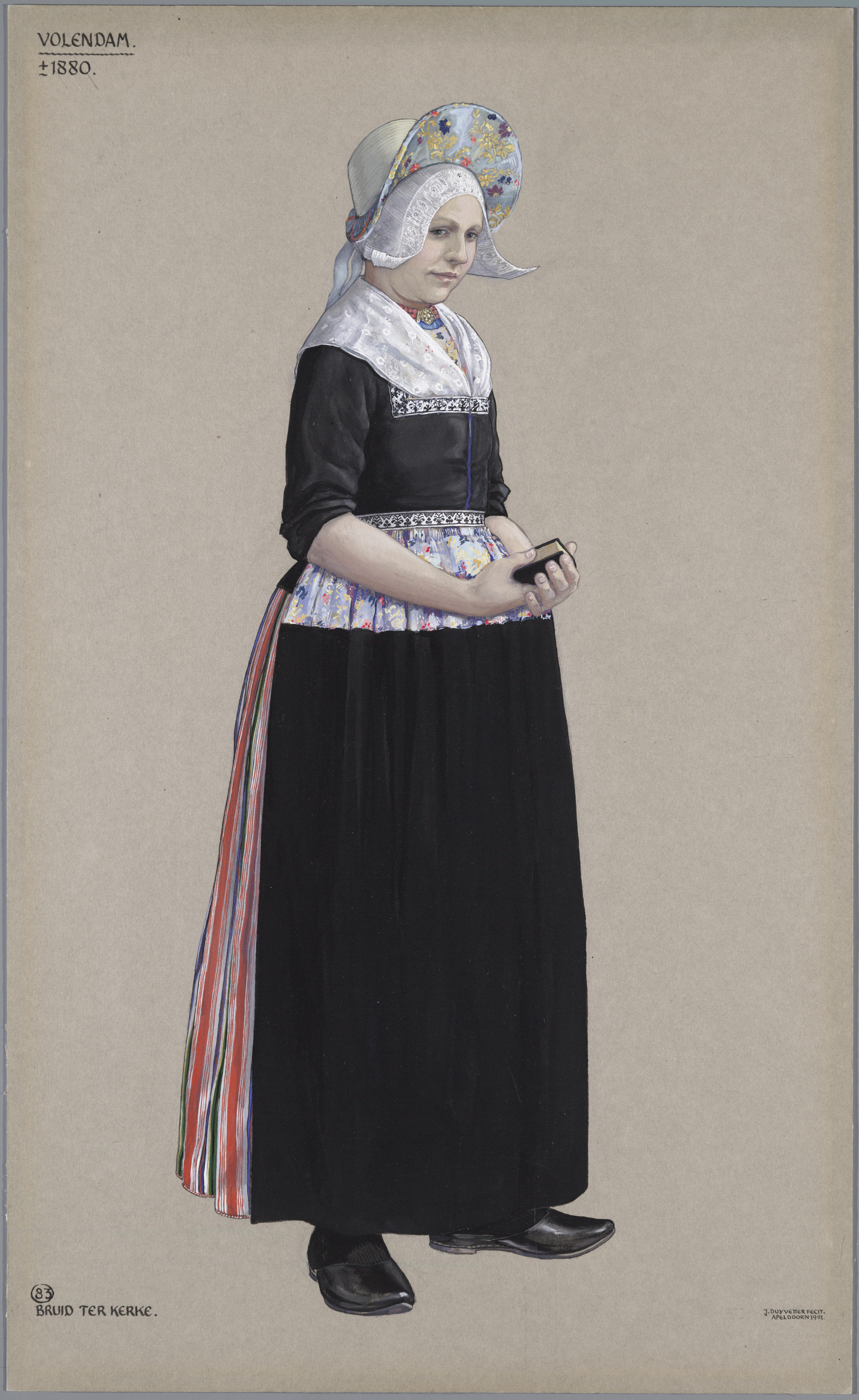 Bruid, gekleed voor de kerk, uit Volendam rond 1880.