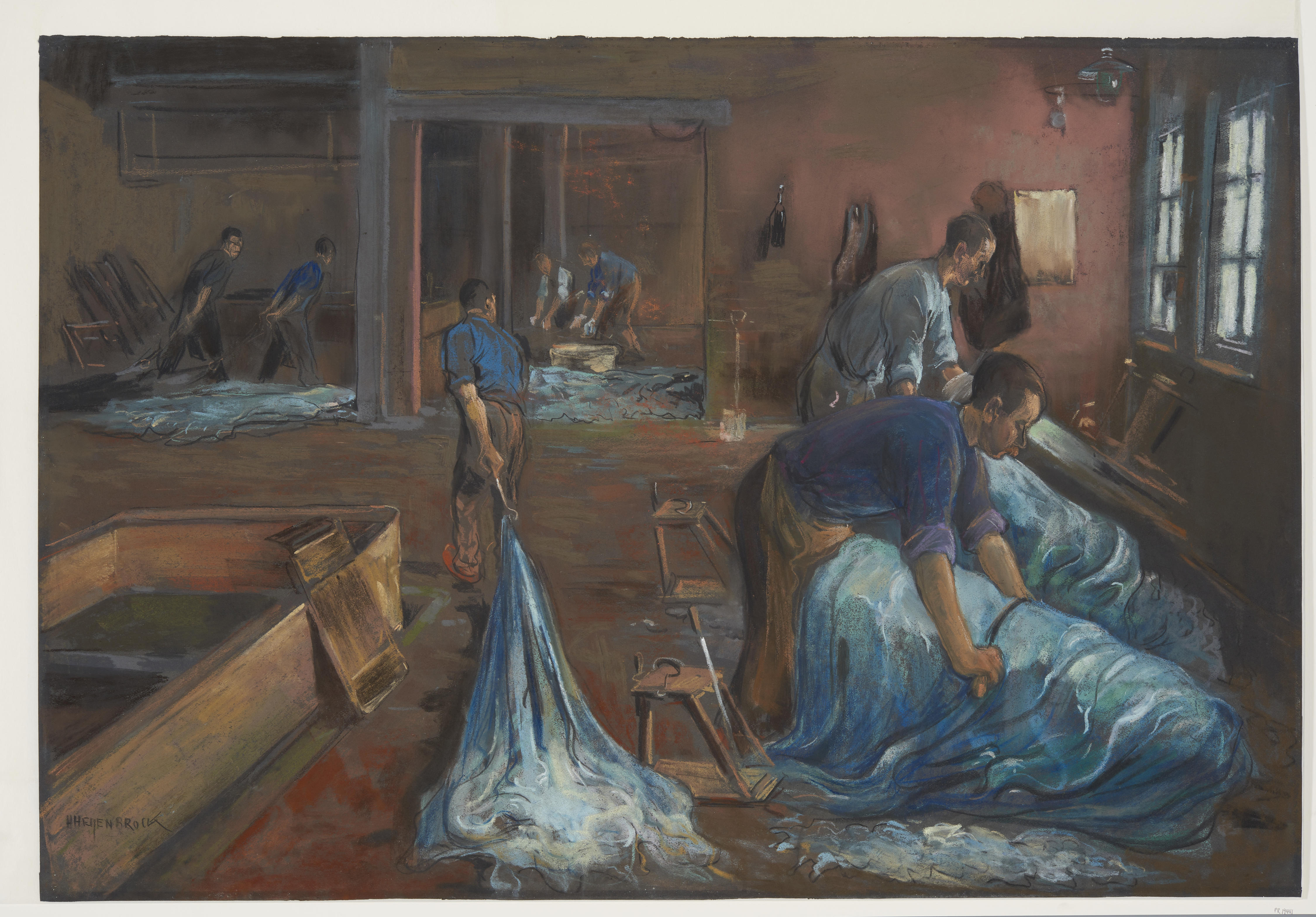 Pastel van het interieur van een ouderwetse leerlooierij. Twee looiers zijn hier bezig met het schrapen van huiden op schuine bokken.