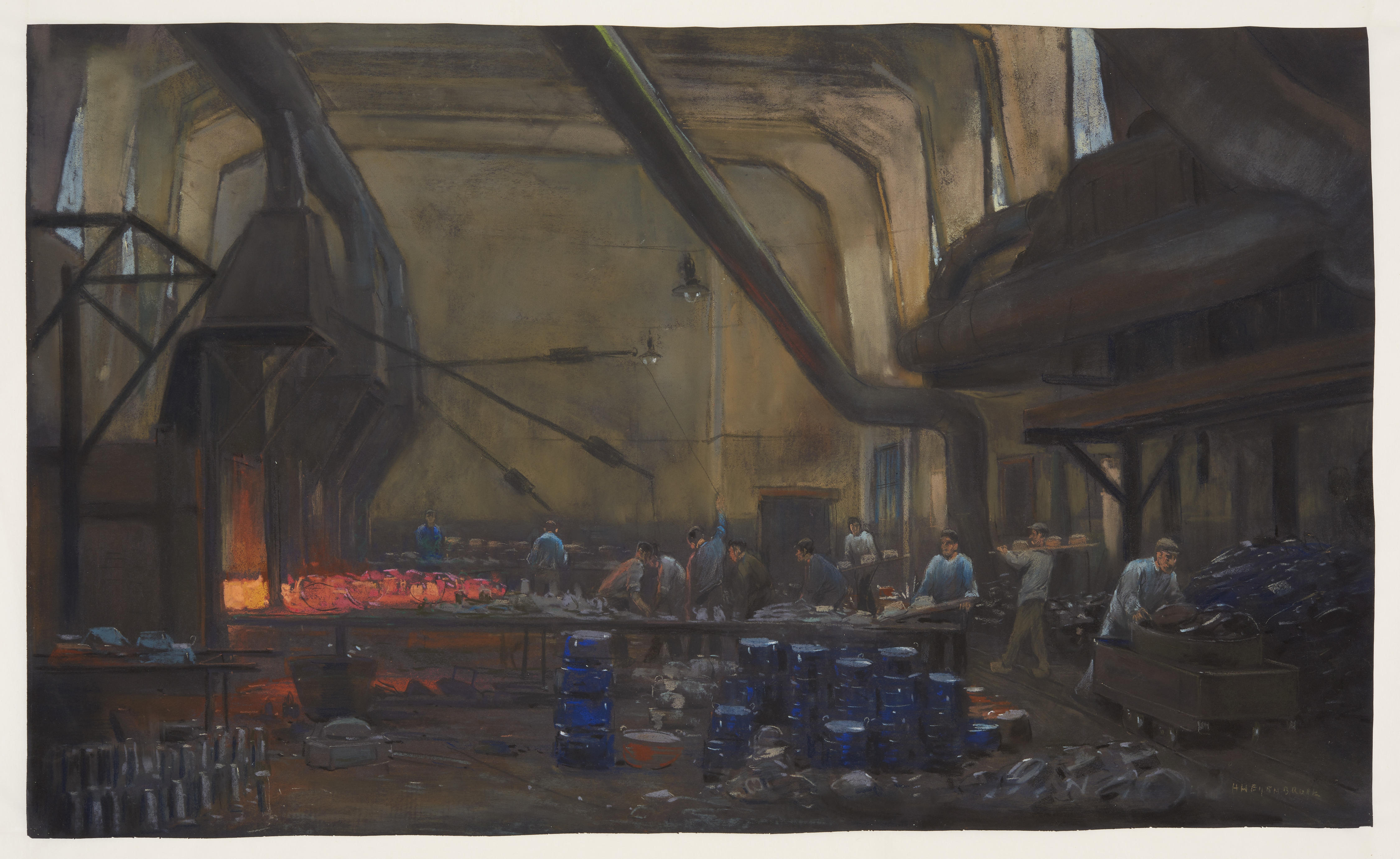 Pastel van DRU, een gieterij in Ulft. Hier werden metalen pannen gedoopt in vloeibaar email en gebakken. Het email was de beschermingslaag tegen roest. Emaillen pannen kwamen in op in de laatste kwart van de negentiende eeuw. Eindelijk hoefde de huisvrouw niet meer op te letten wat ze in de pan deed, zoals ze wel ...