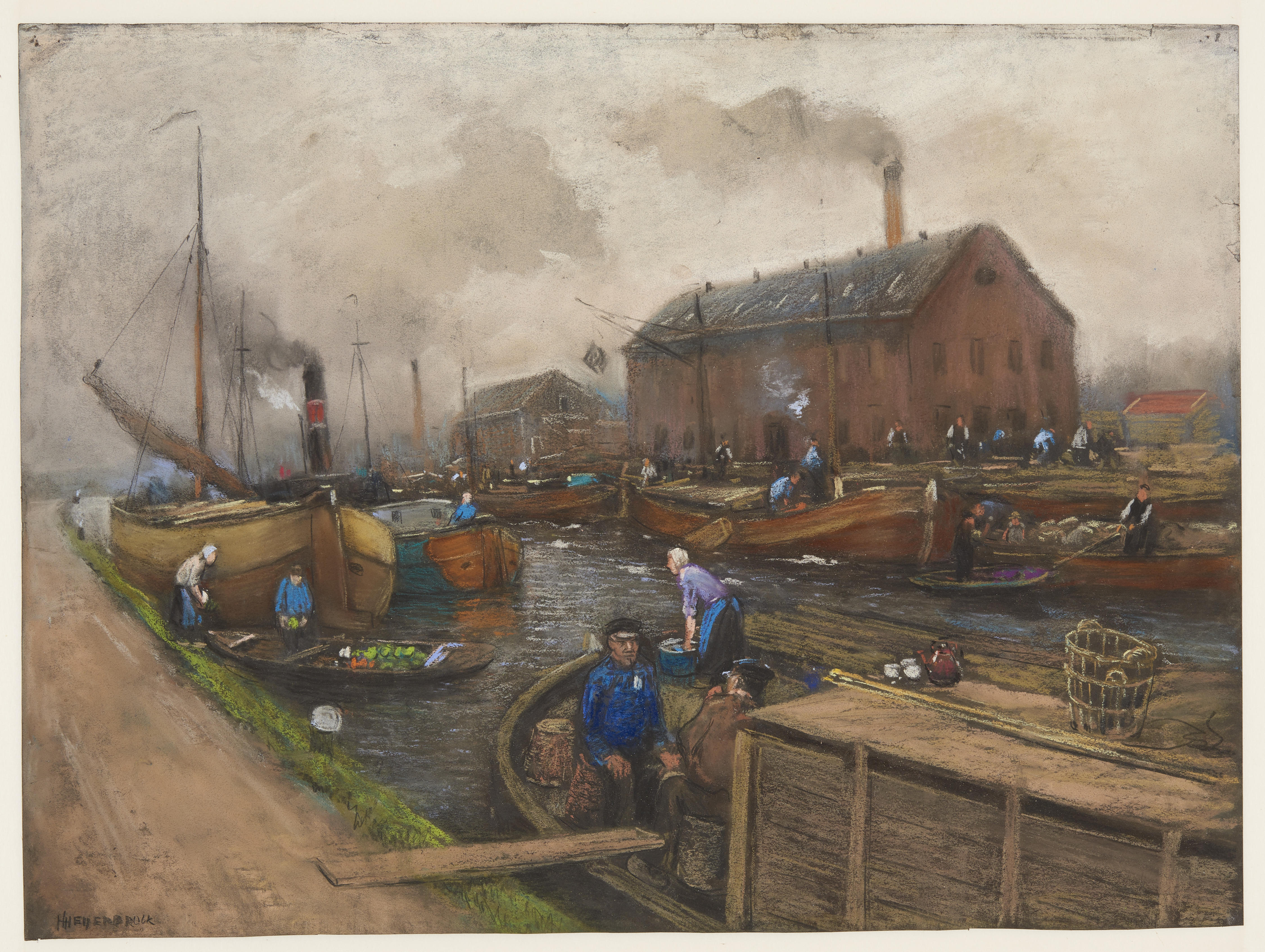 Pastel van een kanaal met diverse schepen en op de achtergrond de aardappelmeelfabriek.