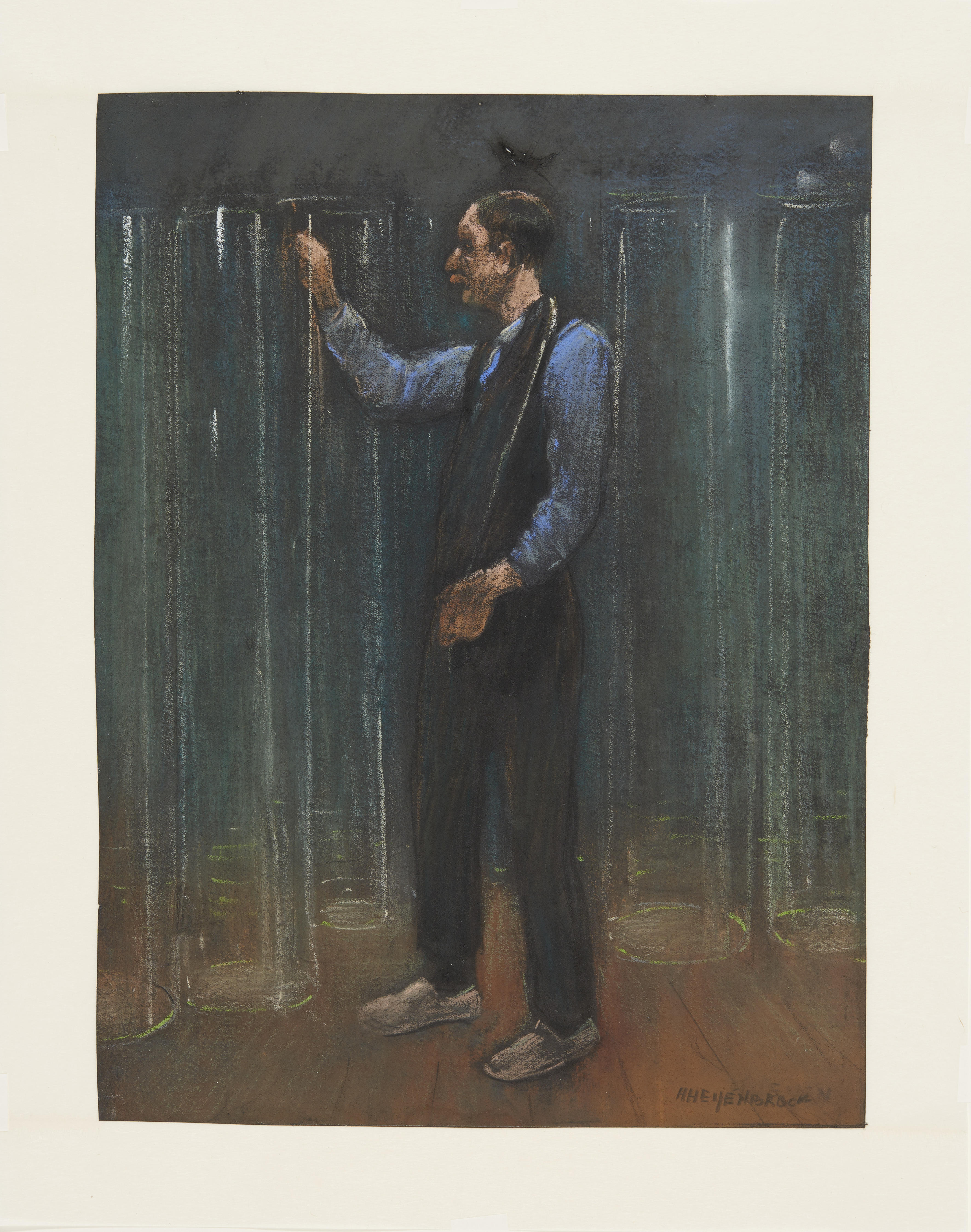 Pastel van een man die bezig is met de controle en het overlangs openkrassen van vensterglascilinders. Dit is stadium tien in het productieproces van vensterruiten.
