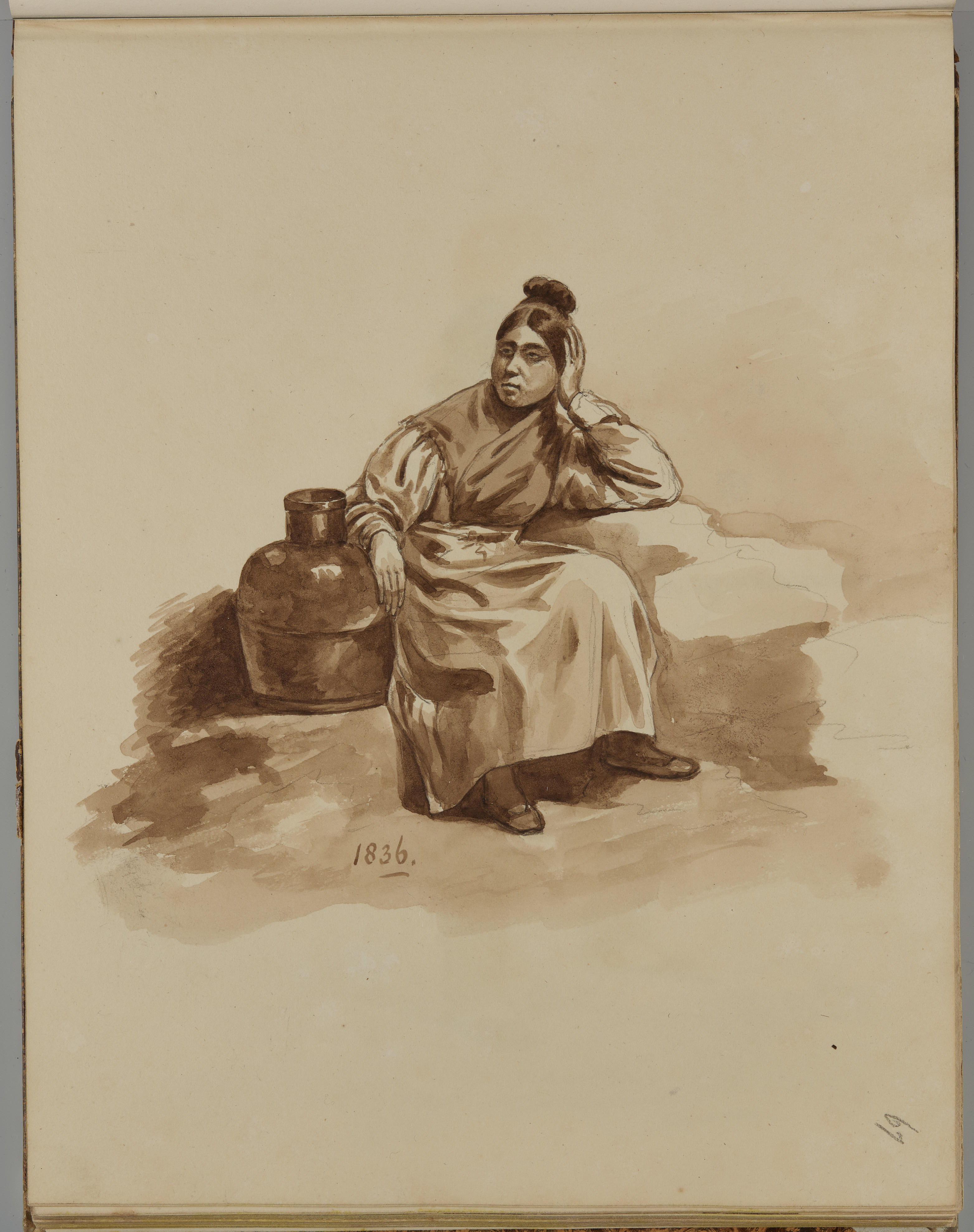 Sepiatekening van een zittende vrouw naast een melkbus, afkomstig uit het schetsboek van J. Looyen (plaat 67).