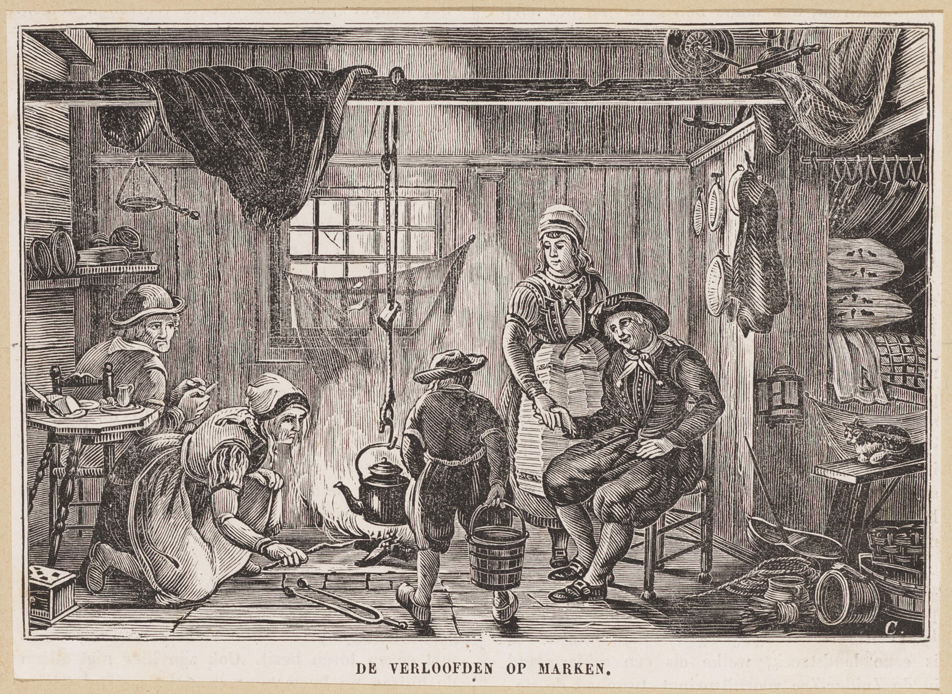 Prent van een Marker interieur met de titel 'De verloofden op Marken'. Deze prent is oorspronkelijk verschenen in 'Penning-magazijn voor de jeugd. Marken en de Markers.' 11e jaargang, nr. 46, 1845. p.364.