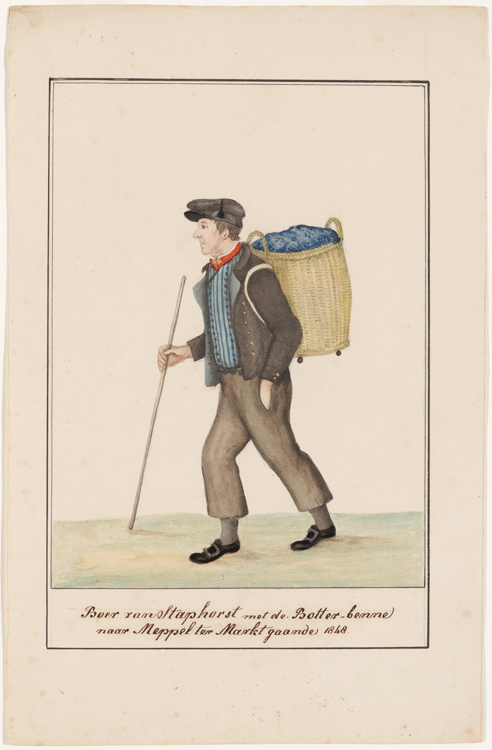 Tekening van een boer uit Staphorst die naar de weekmarkt in Meppel gaat. Hij is bij deze gelegenheid gekleed in zijn doordeweekse nette kleding voor buitenshuis, zijn 'opknapdracht'. Op zijn rug vervoert hij de boter die hij gaat verkopen in een mand.