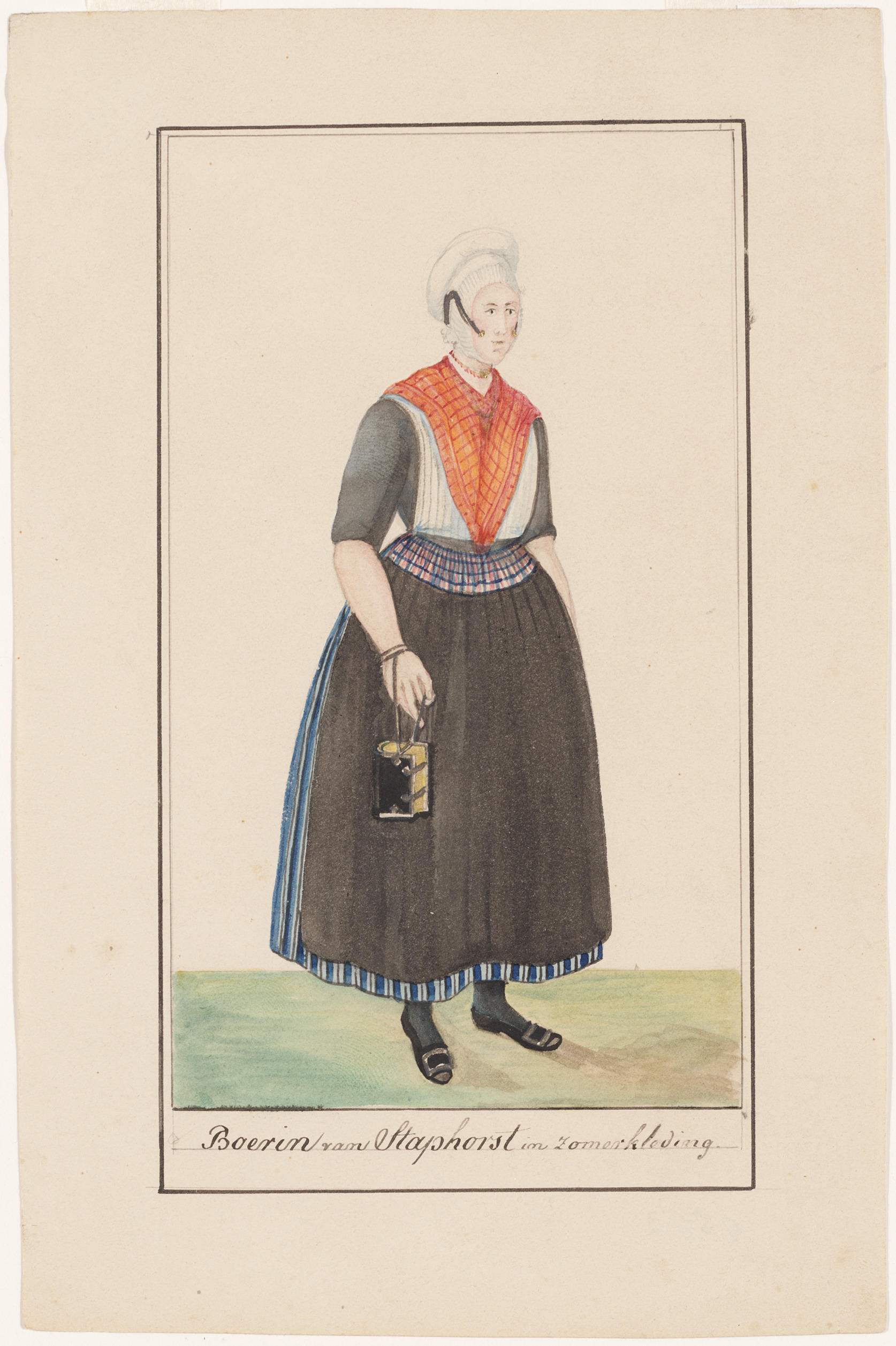 Tekening van een Staphorster boerin die in de zomer naar de kerk gaat. Zij draagt een borstrok met daarover een kroplap en de geruite doek. Op een andere tekening heeft Haasloop Werner de winterse kerkdracht weergegeven. Daarop draagt de vrouw een jak over de doek. Bij beide tekeningen lijkt het oorijzer over de muts te ...