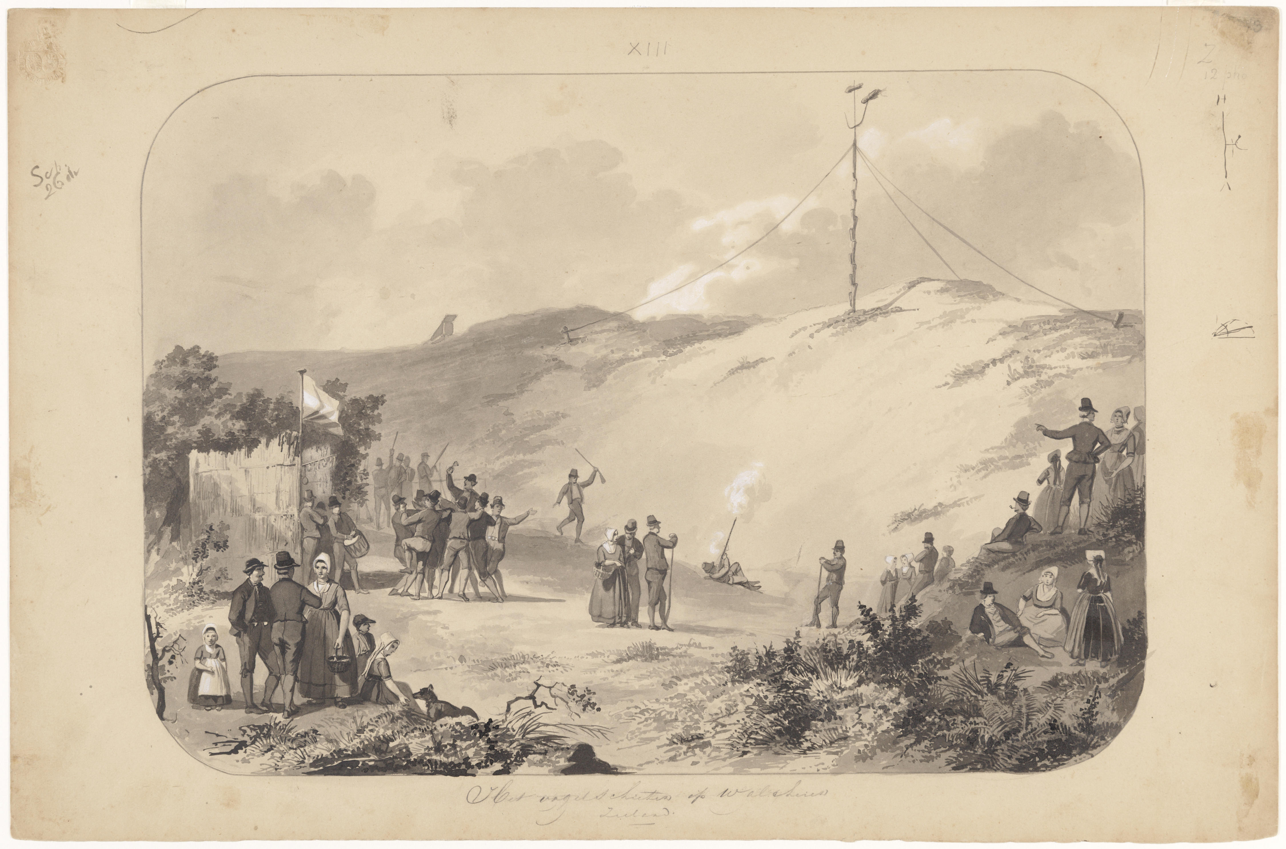 Gewassen Oost-Indische inkttekening, voorstellende het vogelschieten op Walcheren. De tekening is gemaakt voor plaat XIII van: Zeden en Gebruiken, door Bing en Braet von Überfeldt, Amsterdam, 1850-1857.