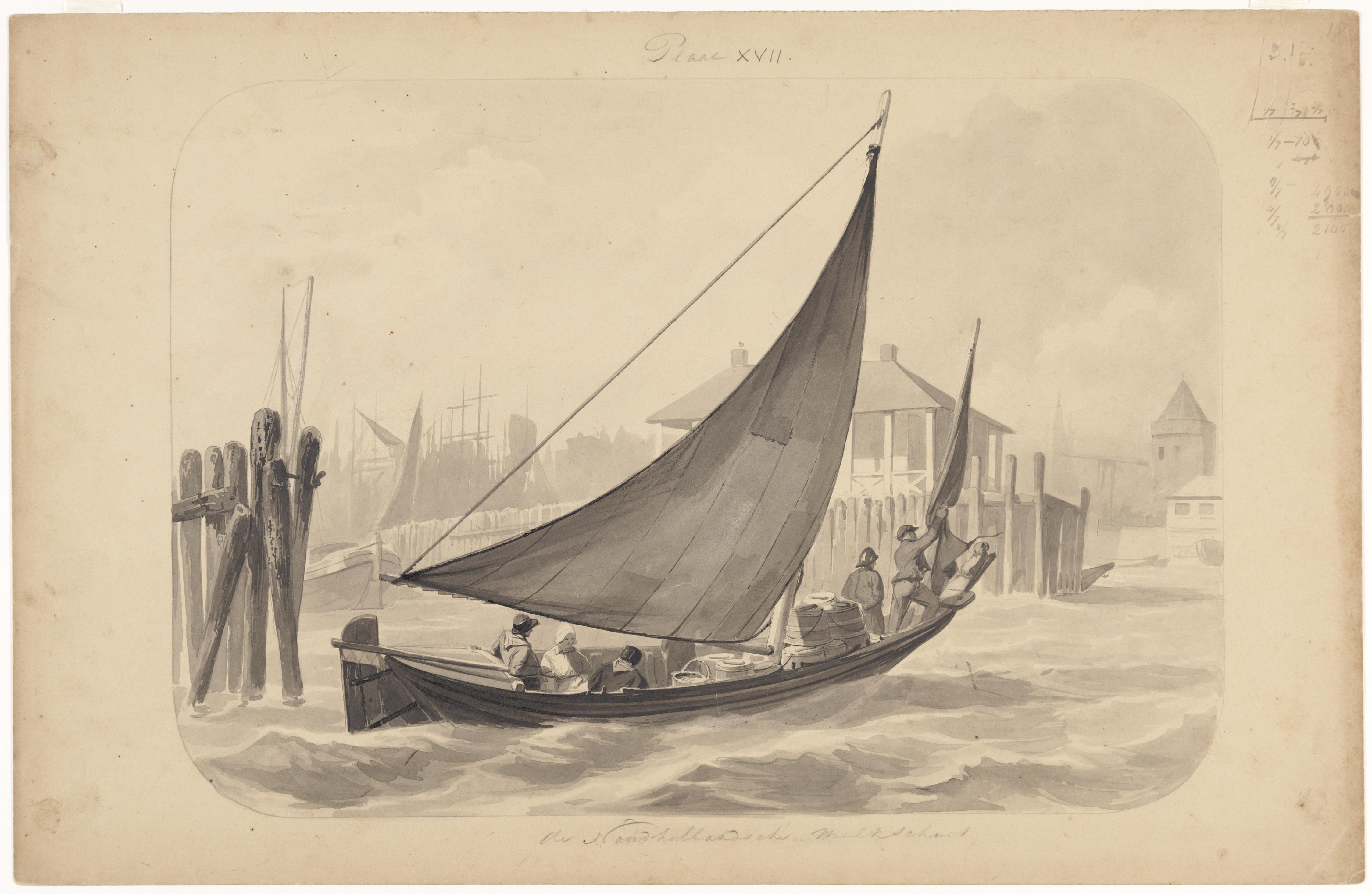 Gewassen Oost-Indische inkttekening, voorstellende de Noord-Hollandse melkschuit. De tekening is gemaakt voor plaat XVII van: Zeden en Gebruiken, door Bing en Braet von Überfeldt, Amsterdam, 1850-1857.