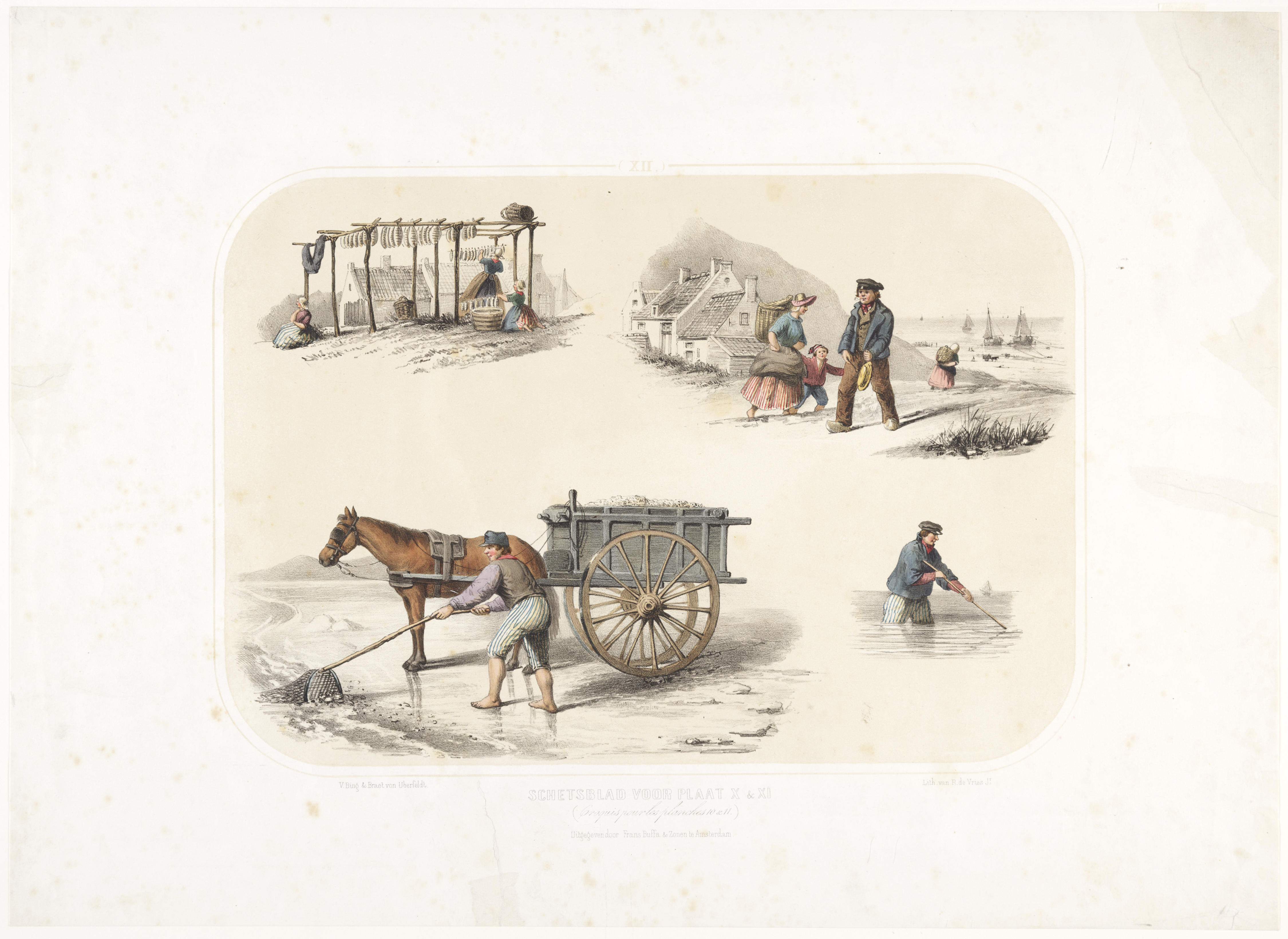 Plaat XII van 'Nederlandsche zeden en Gebruiken' van Bing en Braet von Überfeldt. Linksboven staan vrouwen afgebeeld die vis aan het drogen zijn. Rechts zijn mensen aan het strand te zien en onderaan staan voorstellingen van schelpenvissers.