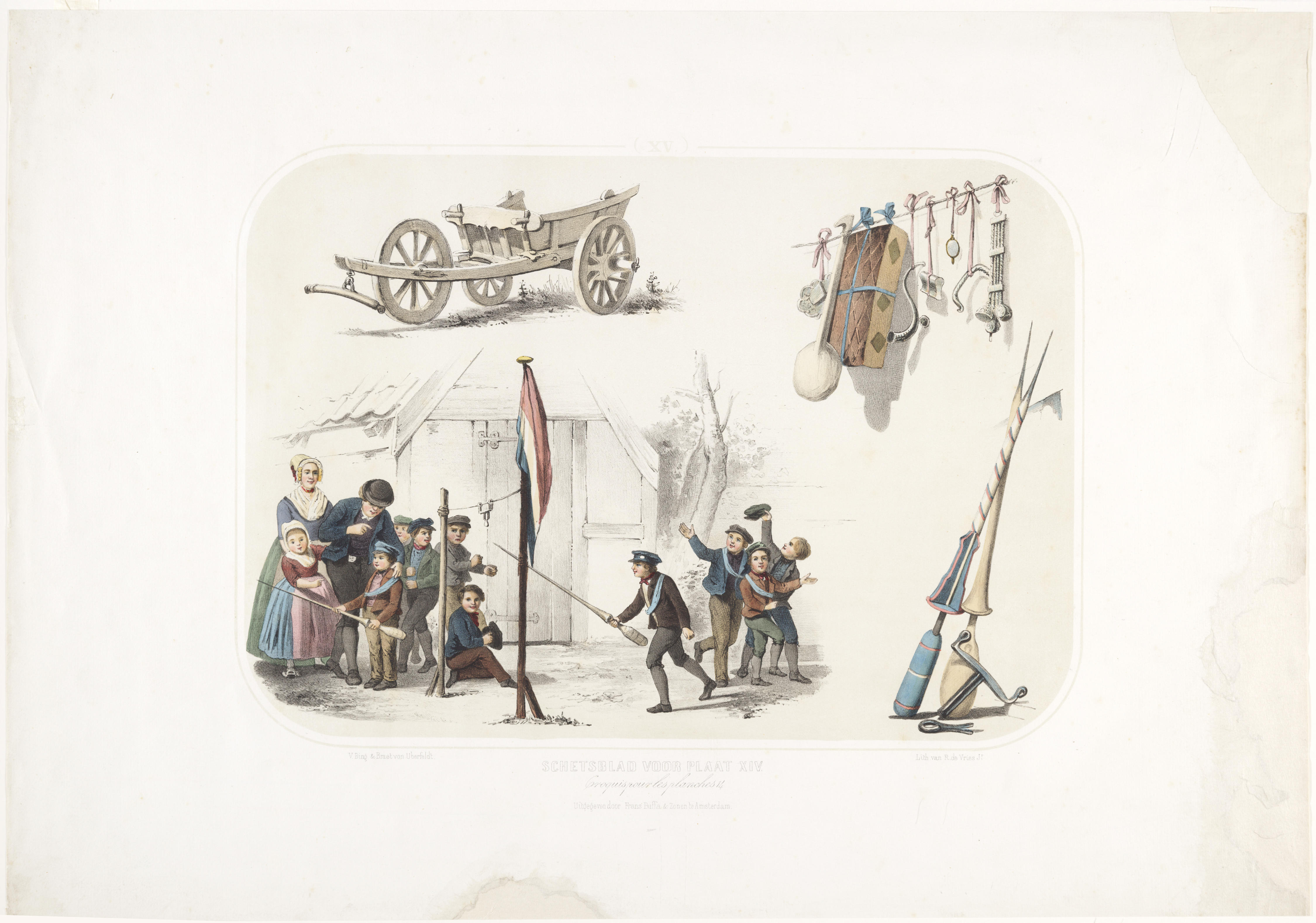 Schetsblad voor plaat XIV van: Zeden en Gebruiken van Bing en Braet von Überfeldt. Linksboven is een driewielskar afgebeeld. Onder is men bezig met ringsteken.