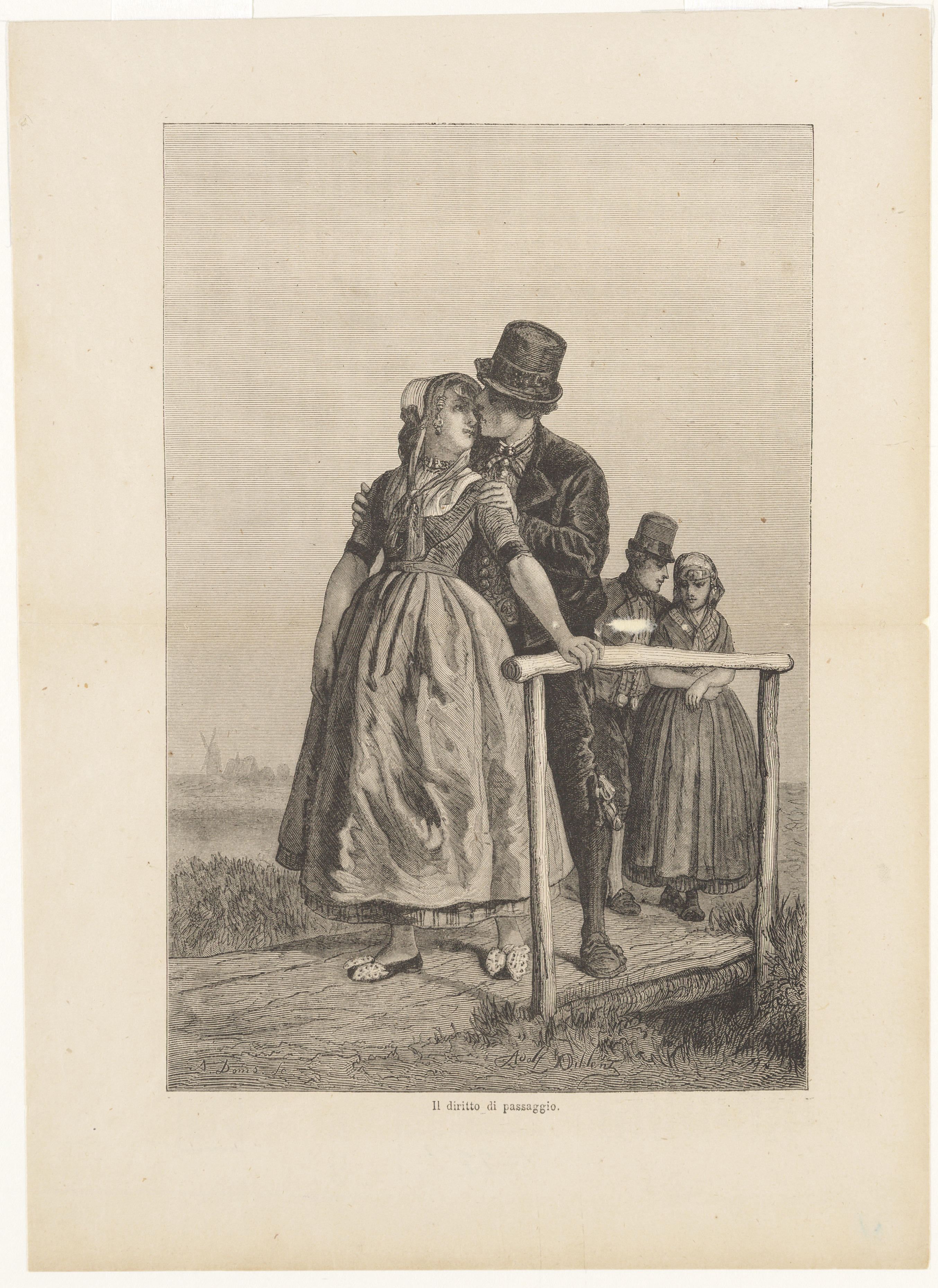 Prent van twee Walcherse paren bij een brug.