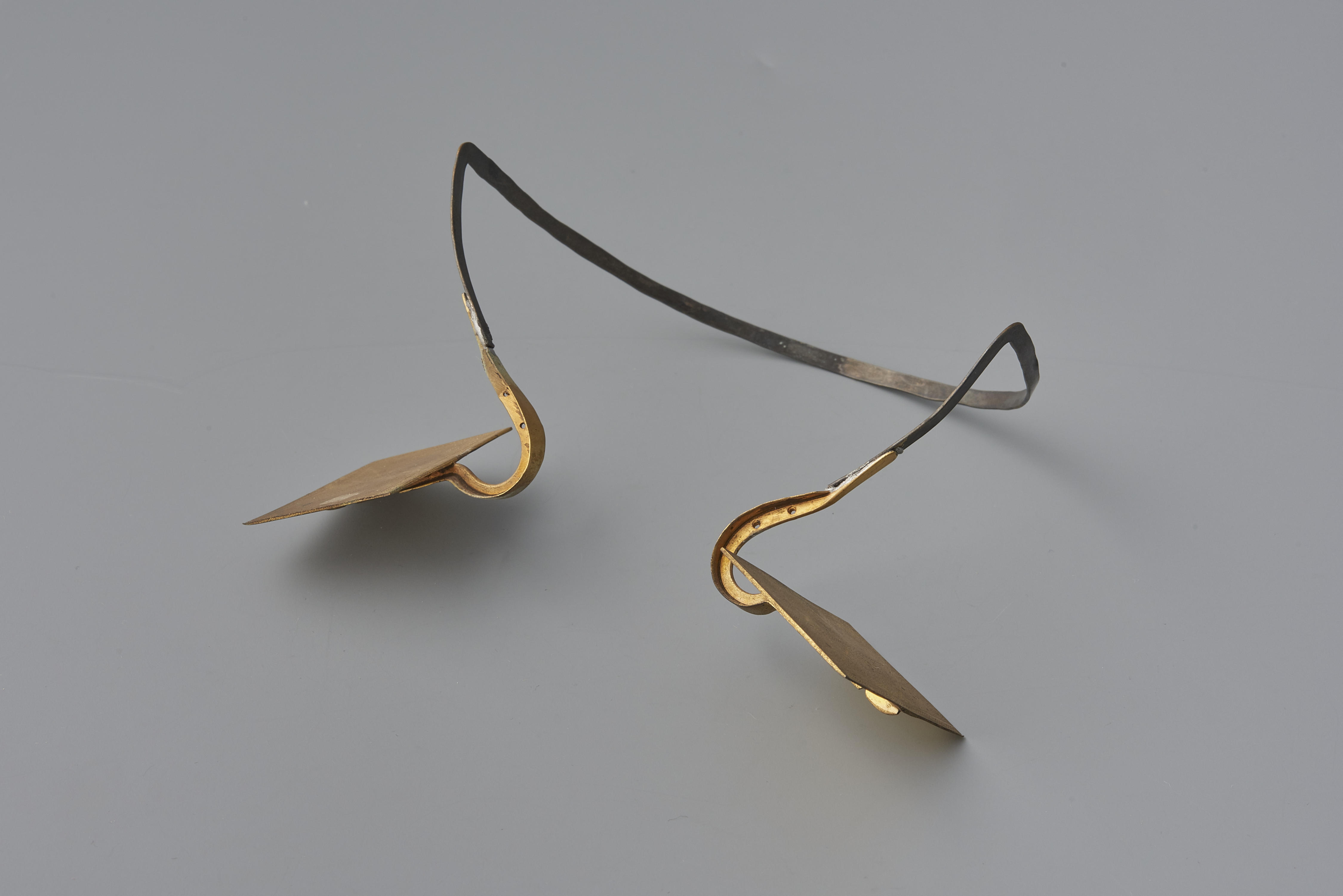 Oorijzer voor een pop die gekleed is als vrouw in streekdracht van Zuid-Beveland. De beugel is van ijzer en de beide stikken zijn van messing. De stikken zijn aan de achterzijde versierd met graveerwerk en zijn mogelijk verguld. In de aanzet van de stikken zitten twee gaatjes. Hierdoor kunnen mutsspelden worden gestoken om het oorijzer ...