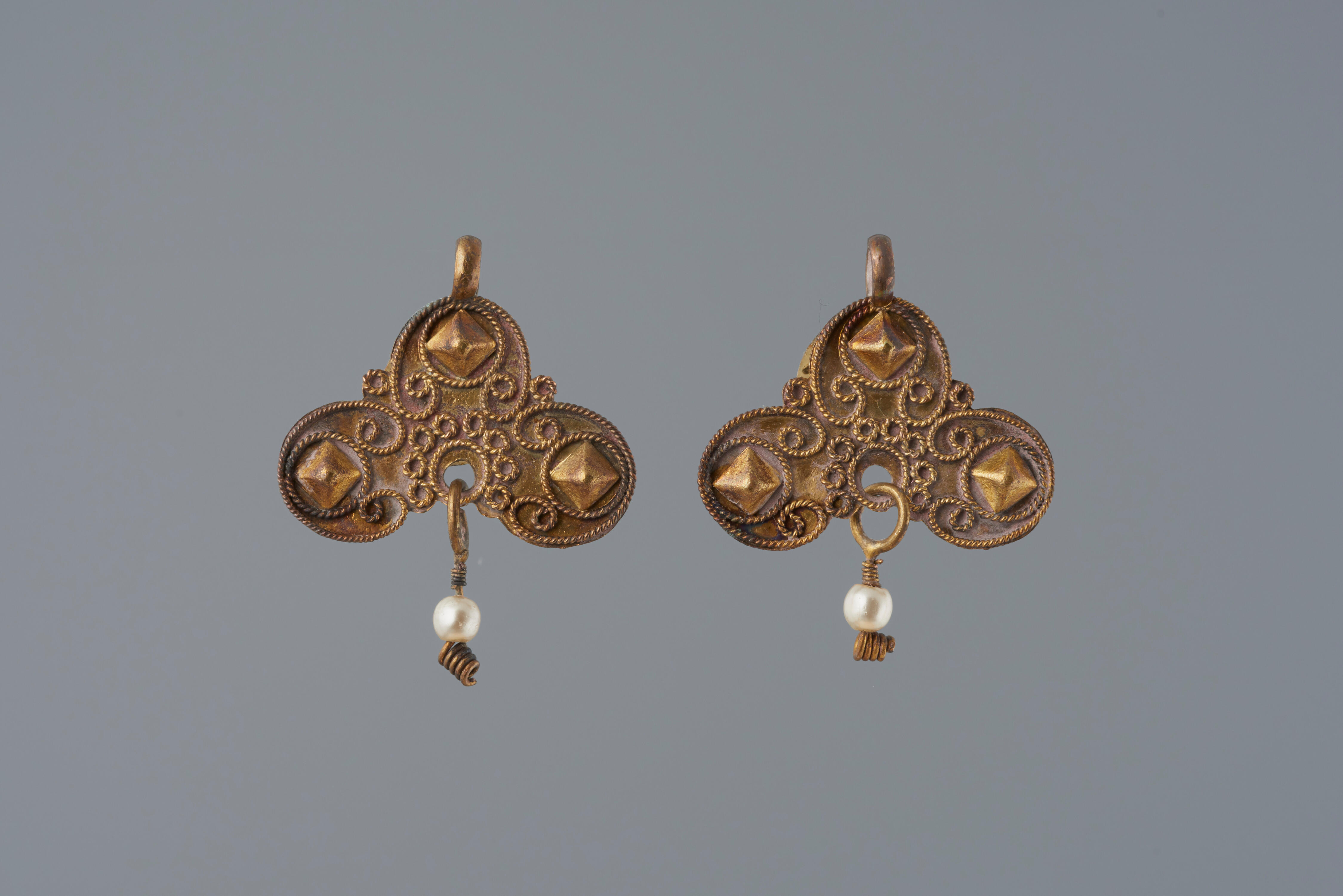 Een paar klaverbladvormige messing oorijzerhangers, zogenoemde 'strikken', voor een streekdrachtpop in streekdracht van het Middelburg Ambacht. Onderaan beide hangers hangt een imitatieparel. Walcherse strikken hebben aan de voorkant piramidevormige noppen, de zogenoemde 'spijkerkoppen'. De achterkant van dit stel is glad. De vervaardiger van de hangers is onbekend, want ze dragen geen merken.