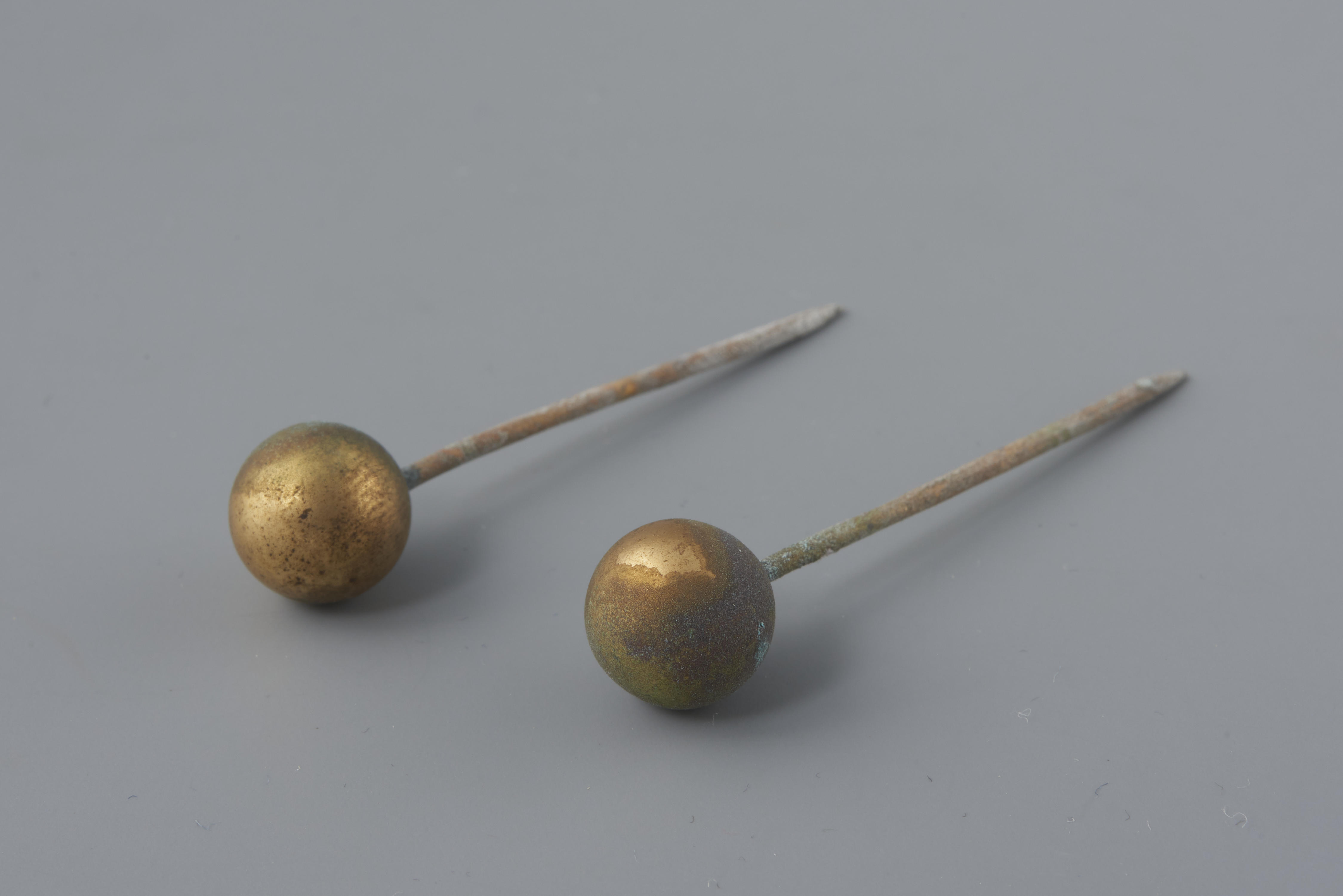 Een paar messing mutsspelden voor een pop, gekleed als vrouw in protestantse streekdracht van Zuid-Beveland. Op Zuid-Beveland wordt dit type 'bolspelden' genoemd. Deze mutsspelden worden in de ondermuts gestoken, tussen de beide uiteinden van het oorijzer. De vervaardiger is onbekend, want er staan geen merken in de spelden.