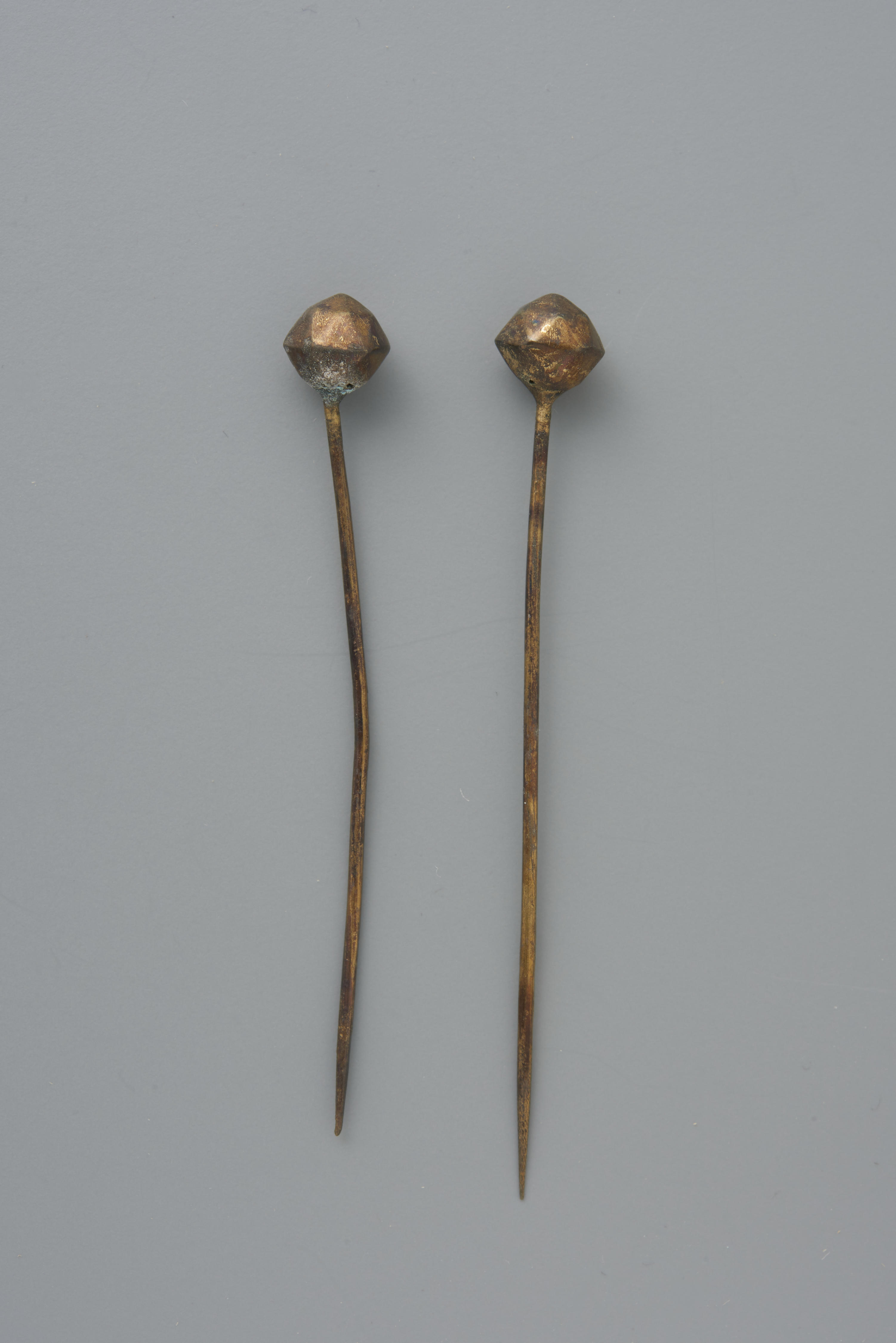 Een paar messing mutsspelden voor een pop, gekleed als vrouw in streekdracht uit Middelburg Ambacht. Deze mutsspelden worden opzij in de ondermuts gestoken. De vervaardiger is onbekend, want er staan geen merken in de spelden.