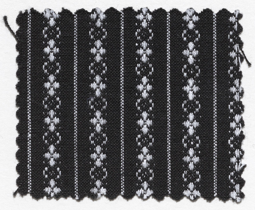Stofstaal van katoenen schortenstof. Zwarte en witte kettingdraden met zwarte inslagdraden, in patroon geweven. Gebruikt als doordeweekse schortenstof in de rouw bij de streekdracht van Zuid-Beveland. Dit van origine Walcherse 'schortenbont' werd vanaf circa 1975 ook op Zuid-Beveland gebruikt voor de doordeweekse schorten, omdat de schortenstof die de Zuid-Bevelandse vrouwen daarvoor gebruikten steeds zeldzamer werd.