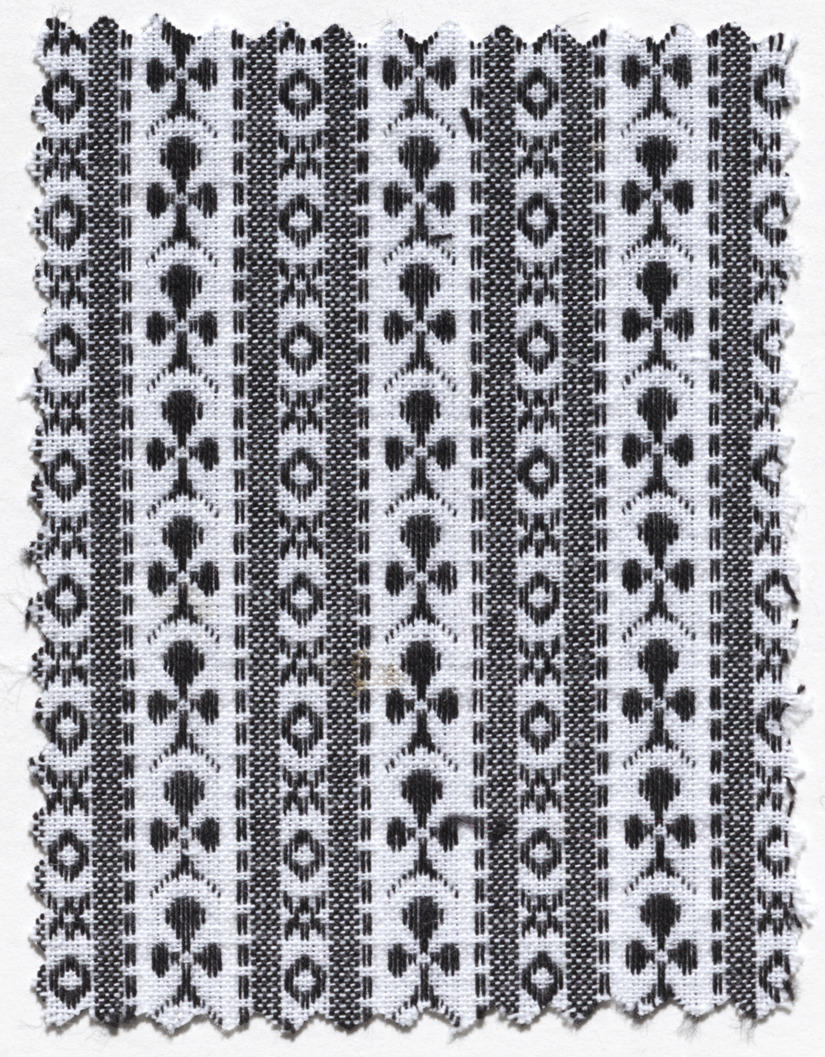 Stofstaal van katoenen schortenstof. Witte en zwarte kettingdraden met witte inslagdraden, in patroon geweven. Gebruikt als doordeweekse schortenstof bij de streekdracht van Zuid-Beveland. Dit van origine Walcherse 'schortenbont' werd vanaf circa 1975 ook op Zuid-Beveland gebruikt voor de doordeweekse schorten, omdat de schortenstof die de Zuid-Bevelandse vrouwen daarvoor gebruikten steeds zeldzamer werd.