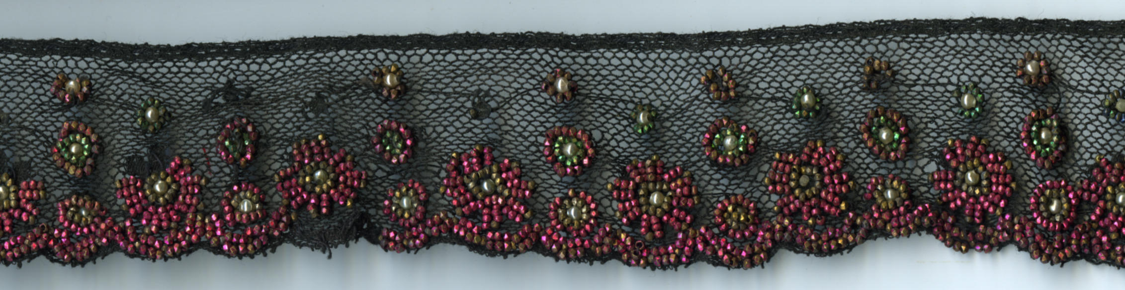 Fragment van een kraalkant, afkomstig van een beuk (kroplap) en gedragen door een rooms-katholieke Zuid-Bevelandse vrouw. De basis bestaat uit zwarte, machinaal geborduurde tule. Op de zwarte motieven zijn kraaltjes gehecht van roze, geel en groen gekleurd metaal en een soort imitatiepareltjes. De kraalkant is geborduurd met de ouderwetse, hoekige kraaltjes die vaak ouder zijn ...