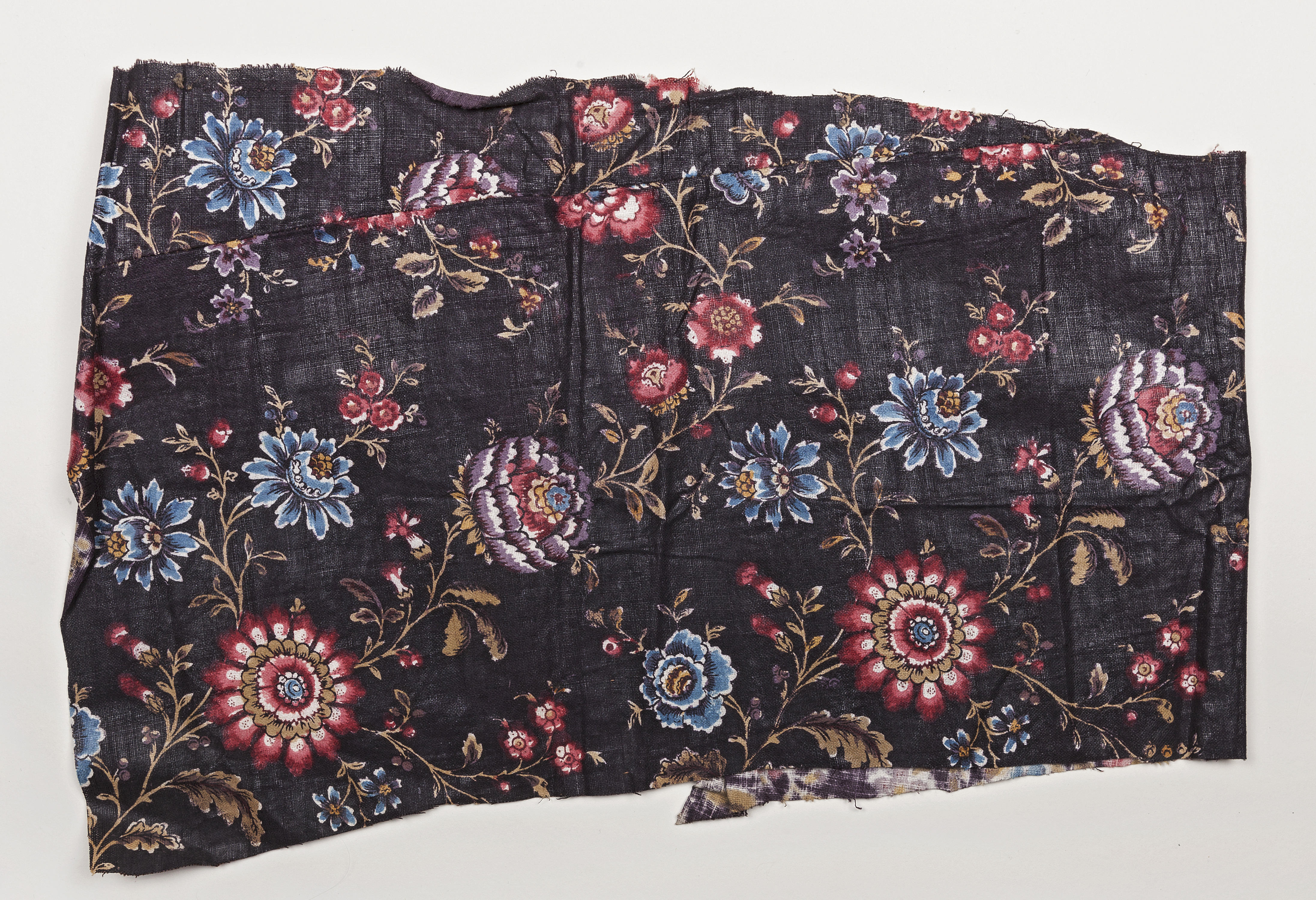 Katoen, bedrukt met bloemmotieven op een donkerbruin fond, zogenaamde nachtgrond. Deze stof is omstreeks 1760 in Europa gedrukt. Dergelijke Europese katoendrukken werden zowel in modedracht als in de Nederlandse streekdrachten gebruikt. De stofstaal bestaat uit twee delen die met de hand aan elkaar zijn gezet.