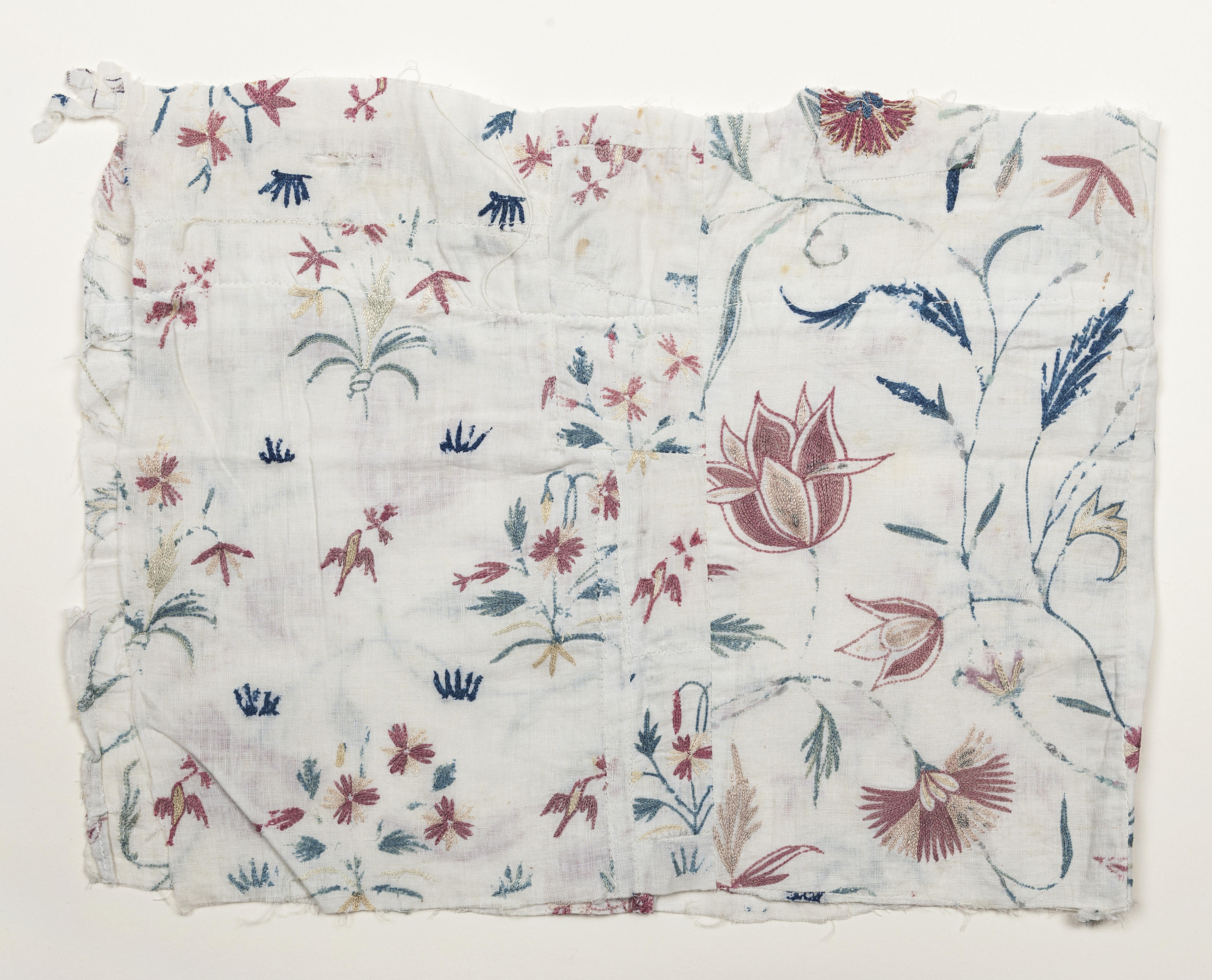 Fragment van effen witte katoen met getamboereerde motieven, vervaardigd in India in de achttiende eeuw. Het fragment bestaat uit diverse stukken die machinaal aan elkaar zijn gezet. Er zijn stukken met twee verschillende motieven gecombineerd. In verschillende museale collecties worden jakken en rokken van deze stof bewaard.