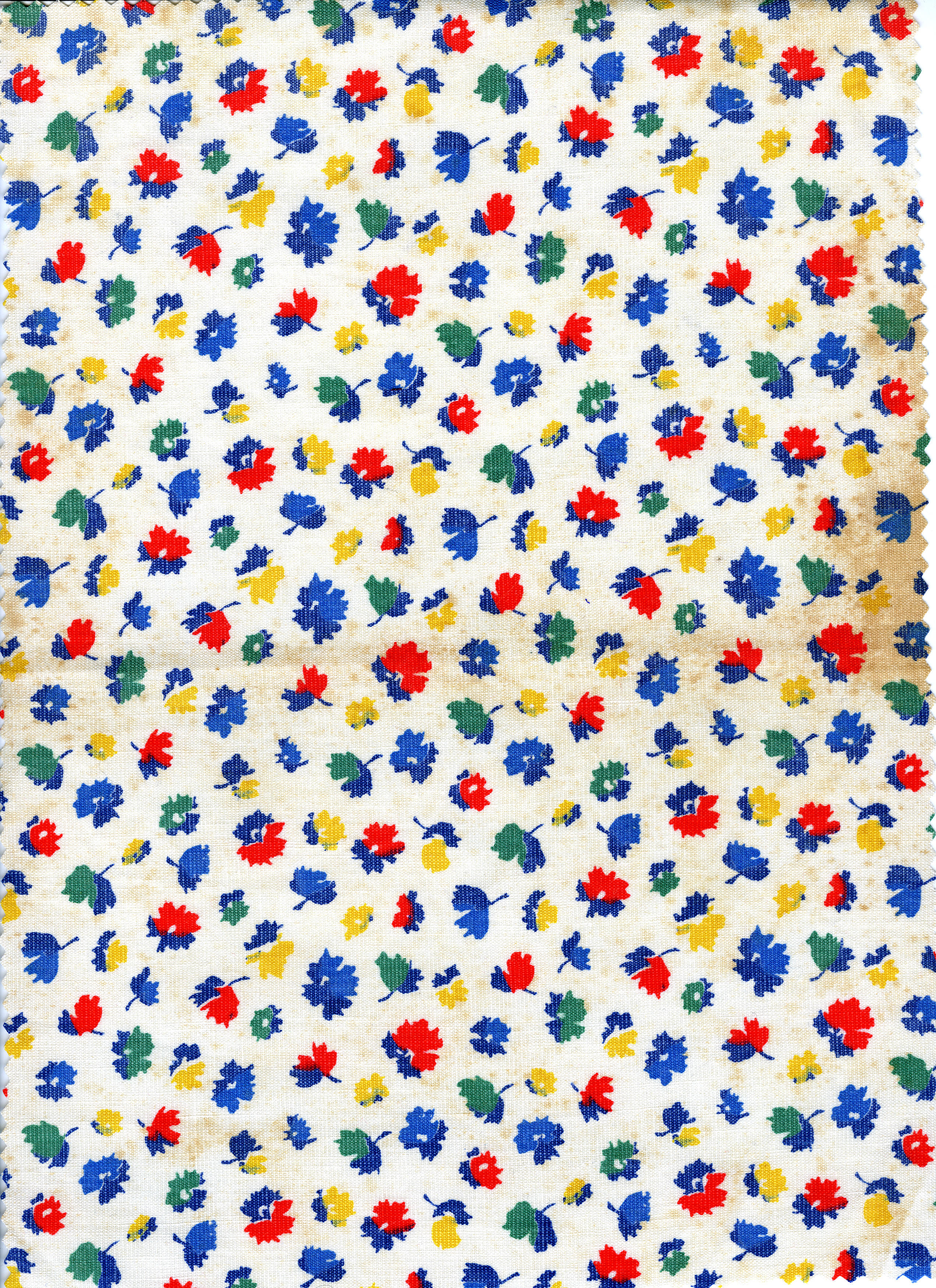 Gedessineerde katoen met een wit fond, bedrukt met meerkleurige blad- en bloemmotieven. Gebruikt voor daagse kraplappen in Bunschoten en Spakenburg. Kraplappen van deze stof werden tot het midden van de twintigste eeuw gedragen bij de werkdracht.
