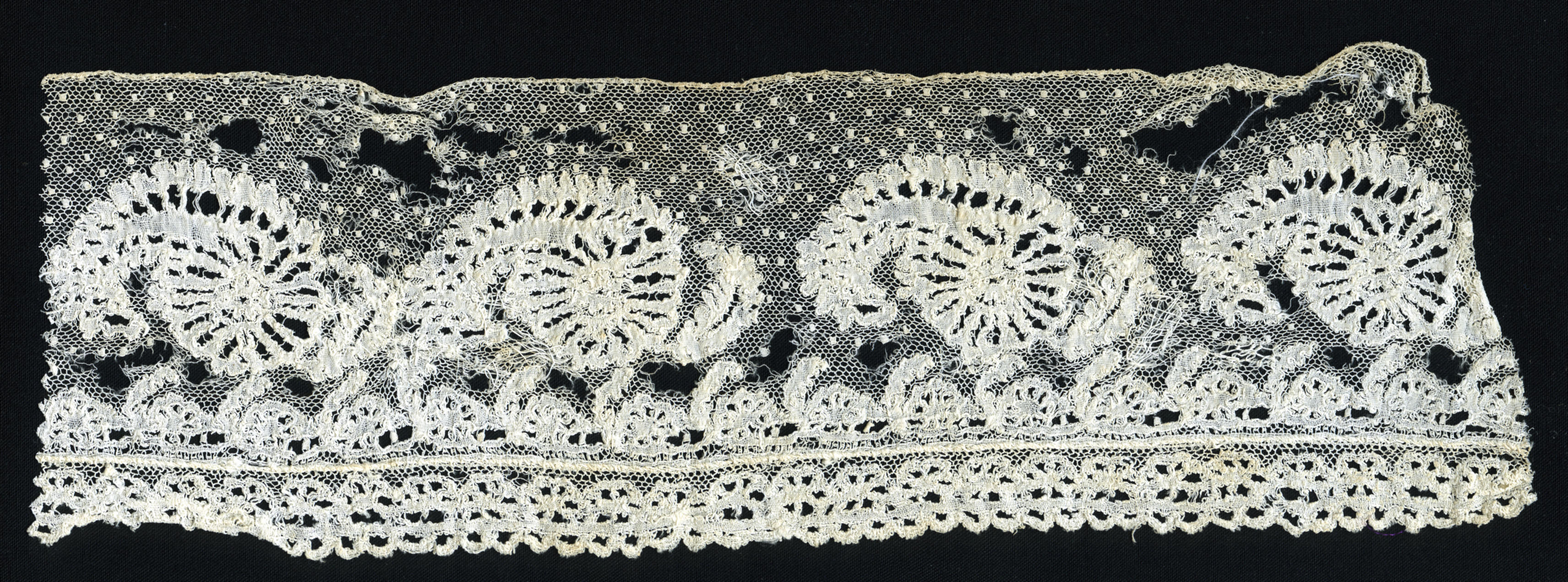 Stofstaal van een zogenaamde 'reep' en een 'puntje' voor een muts. De zogeheten reep en het puntje zijn onderdelen van de Zuid-Bevelandse vrouwenmuts. Aan de 'achtermuts' van effen batist of fijne katoen worden drie kantstroken gezet, achtereenvolgens de 'pluumkant', de 'reep' en de 'punt'. Deze reep en punt dateren uit het derde kwart van de ...