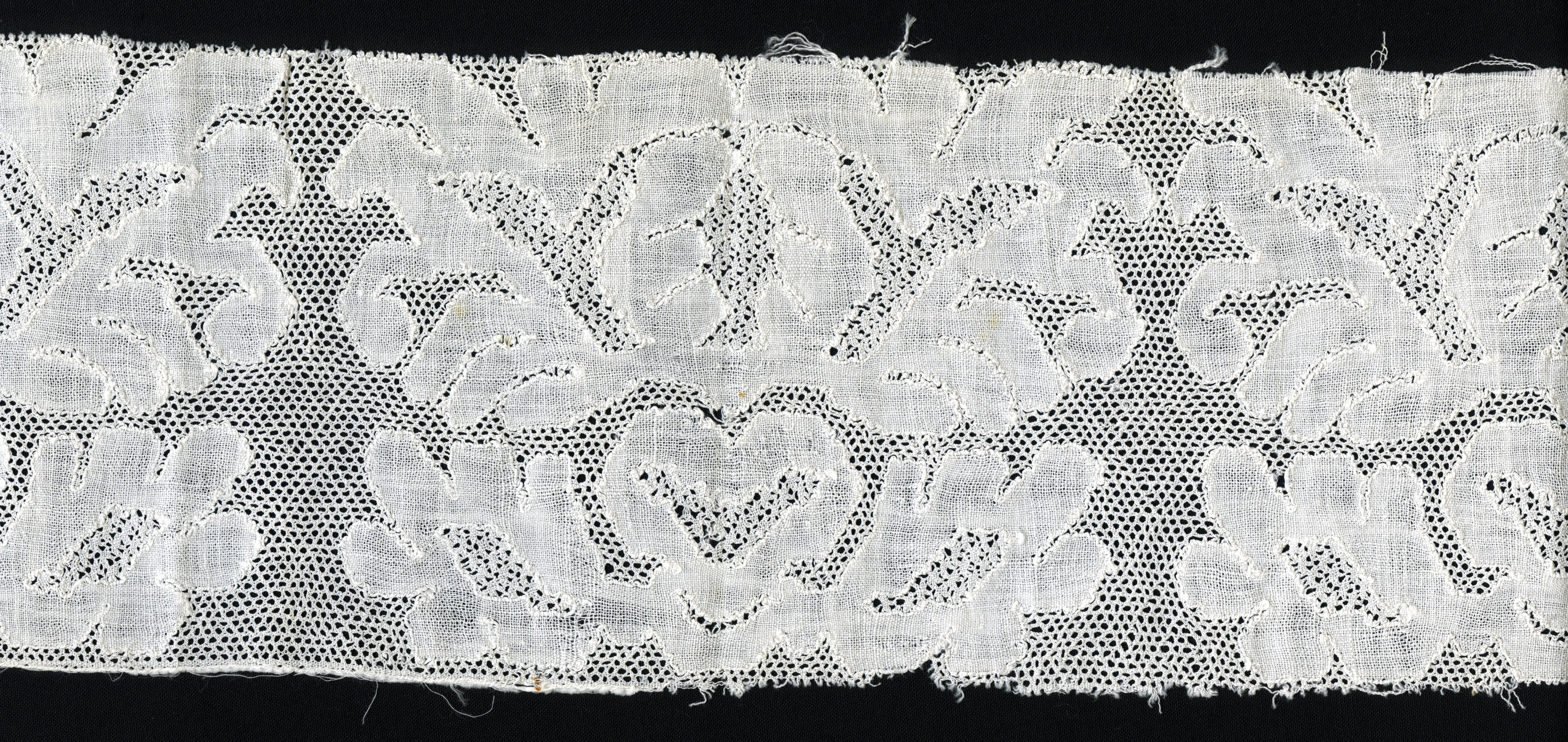 Stofstaal van een zogenaamde 'pluumkant' voor een muts. De kant heeft een Parijse grond. In de motieven is als vulling een siergrond toegepast. De zogeheten pluumkant is een onderdeel van de Zuid-Bevelandse vrouwenmuts. Aan de 'achtermuts' van effen batist of fijne katoen worden drie kantstroken gezet, achtereenvolgens de 'pluumkant', de 'reep' en de 'punt'.