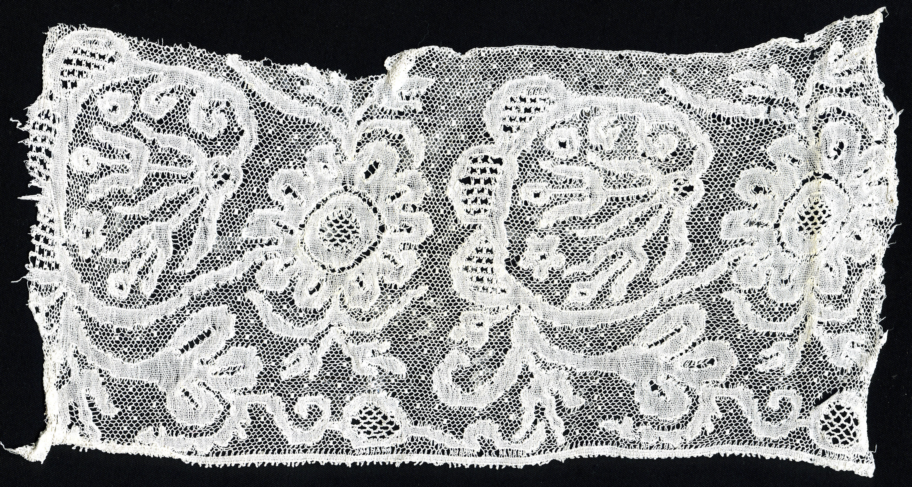 Stofstaal van een kloskant met Rijselse grond. Er zijn twee verschillende siergronden in deze kant toegepast, zogenaamde 'leerkens' (laddertjes) en 'luizen'. De luizen zitten in de harten van de grote bloemmotieven en in de ronde motieven langs de onderrand. De leerkens zijn de ladderachtige siergronden in de bladmotieven (bijvoorbeeld rechts, waar de kant is afgeknipt). ...