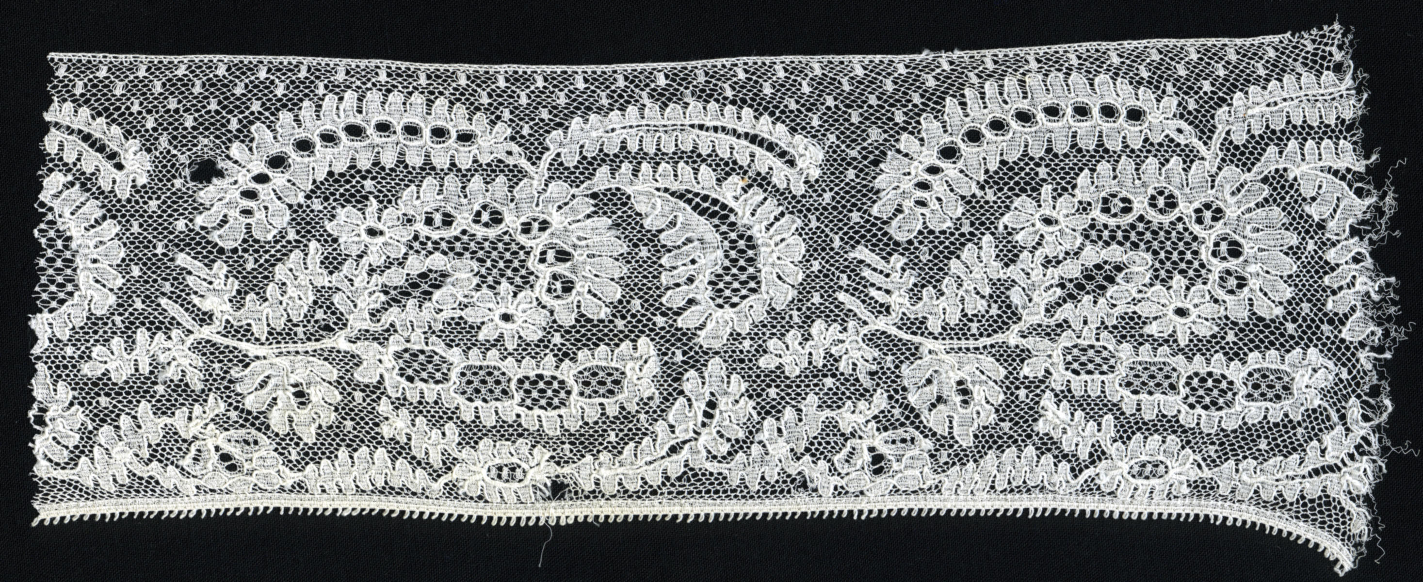 Een strook machinale kant. Dergelijke kant werd gebruikt aan onder meer hullen en kornetmutsen in verschillende plaatsen in Nederland.